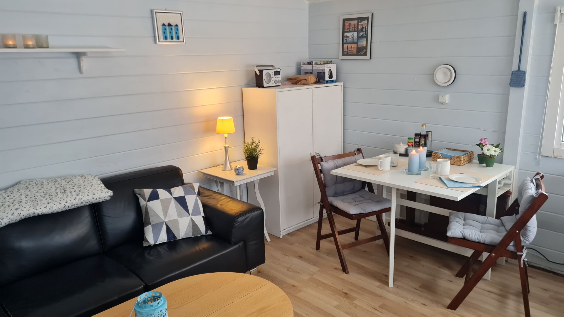 Februar 2026 - nu med spisekøkken! Vi fandt dette fine klapbord i Ikea, så vi kan sidde lidt mere ordentligt, når vi spiser. Det kan slås op i begge sider, så der kan sidde fire personer og spise -
