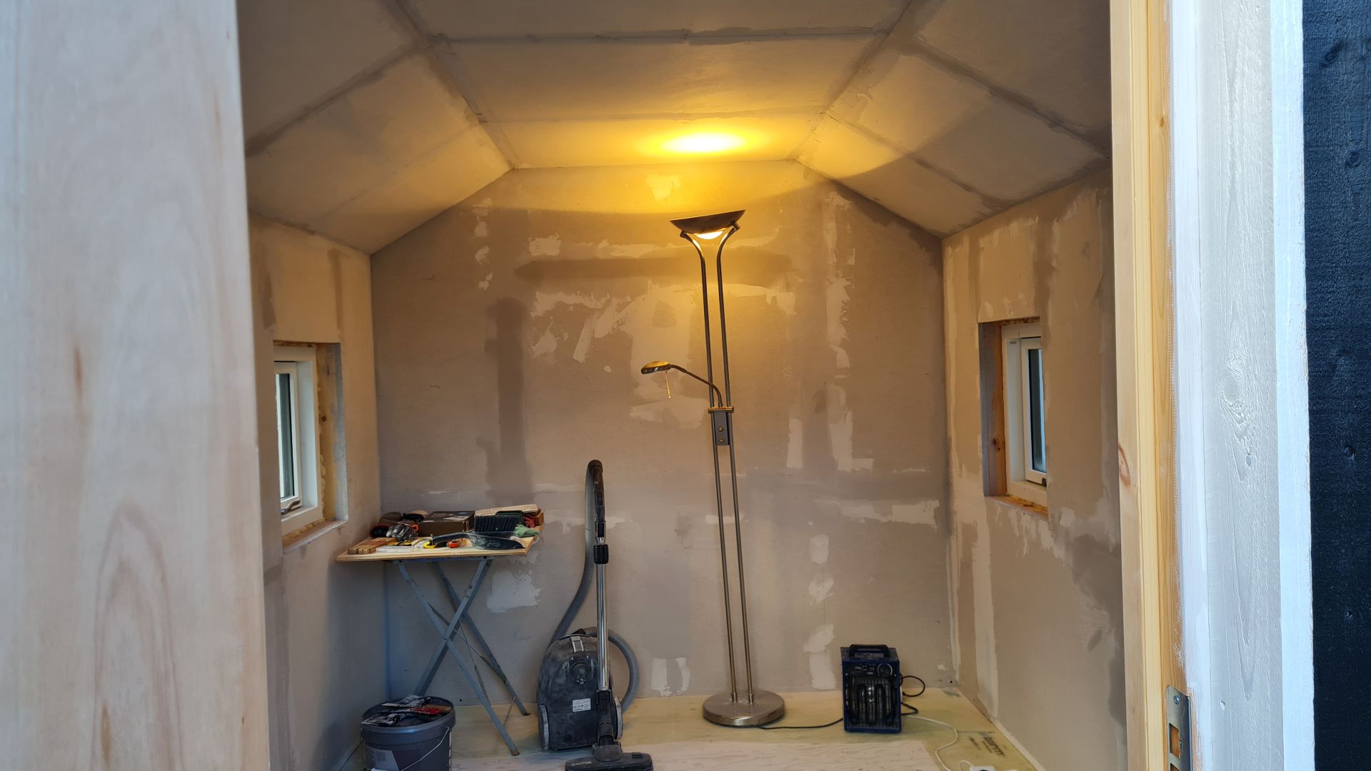 Udvendigt var bjælkehytten stort set færdig med fire termoruder (to som kan åbnes og to med fastkarm), isoleret dør og 120 mm isolering i gulvet, men indvendig kræver det lige lidt knofedt, inden vi kan bruge det som soveværelse.