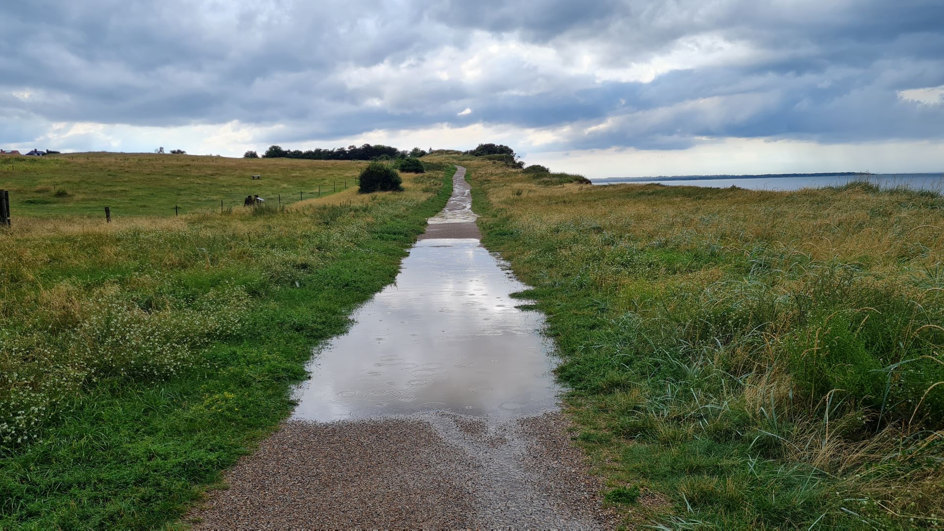 | Det var vist lidt spild af tid at gå omvejen gennem sommerhusområdet, regnen væltede ned, og vi blev