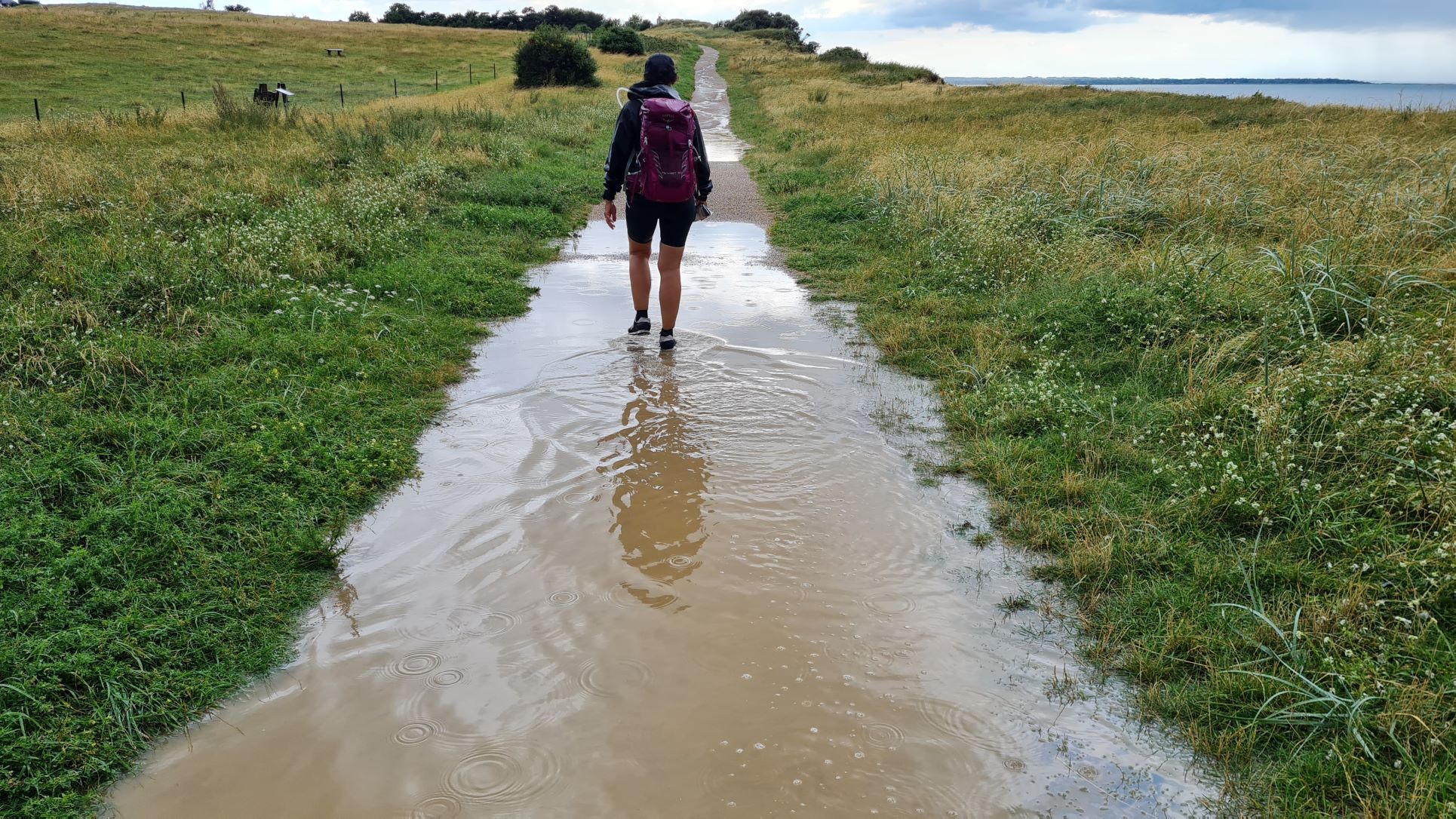 | Det kunne ikke betale sig at forsøge at gå uden om vandpytterne, da vi var gennemblødte, så