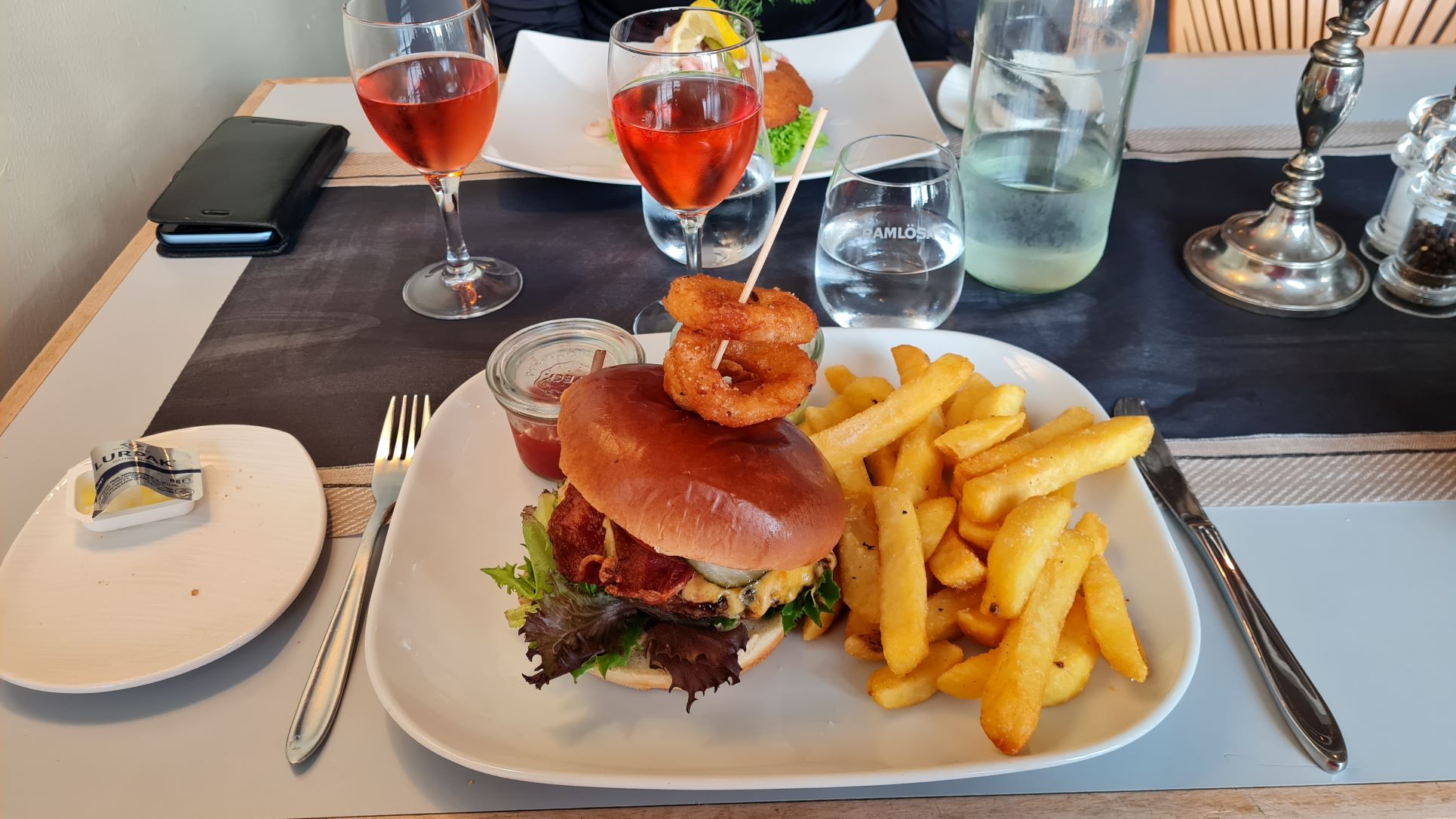 | Efter den første etape på næsten 23 km havde vi fortjent et godt pilgrimsmåltid med husets bedste burger