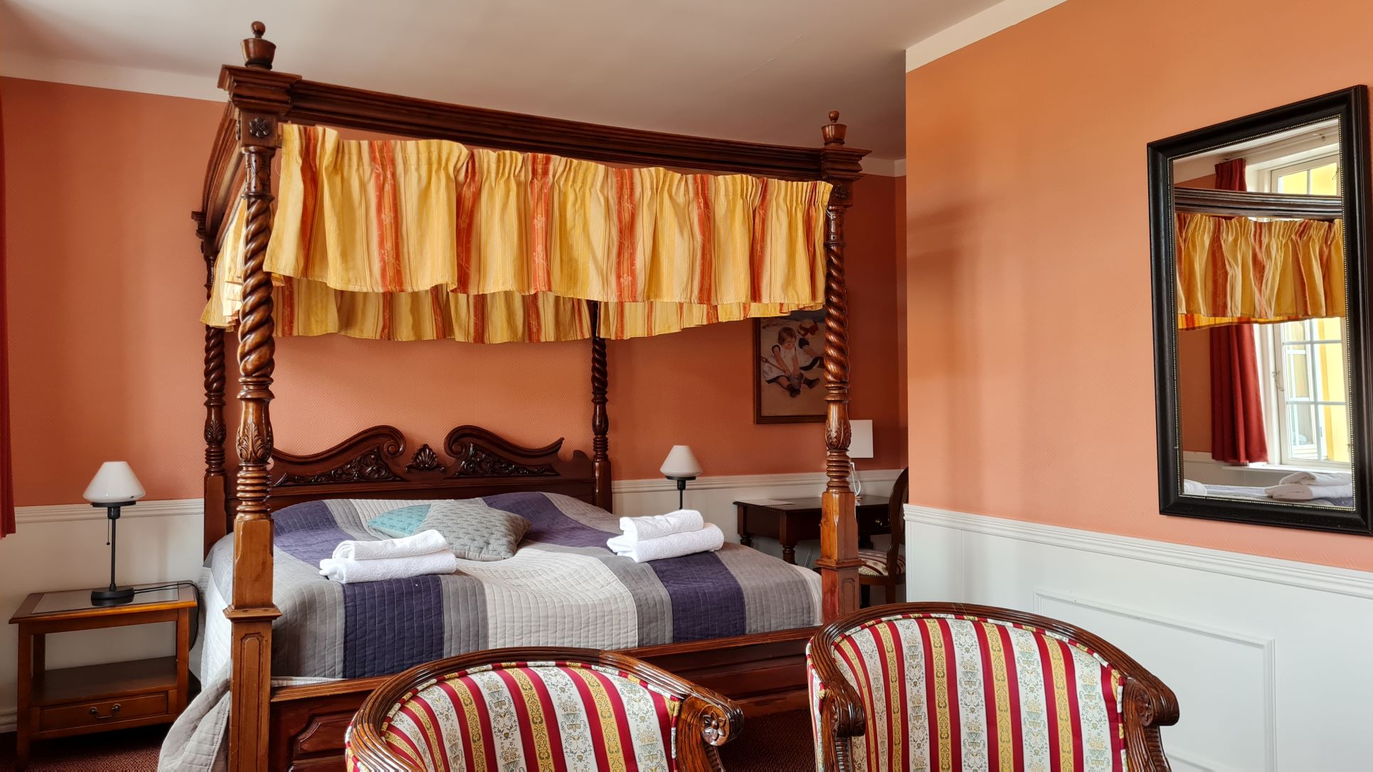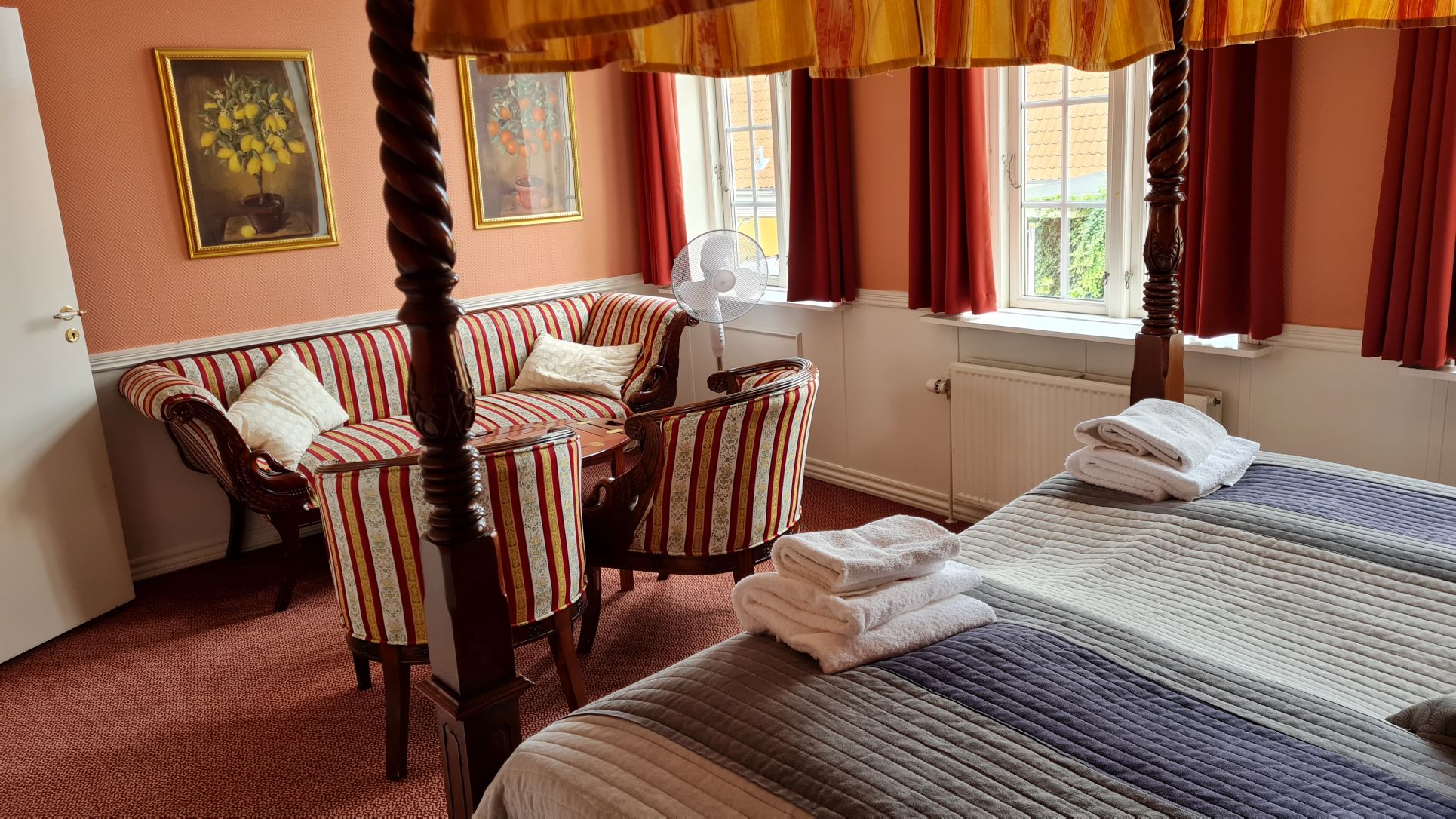 skulle overnatte på Hotel Frederiksværk. Værelset bød på en flot himmelseng.