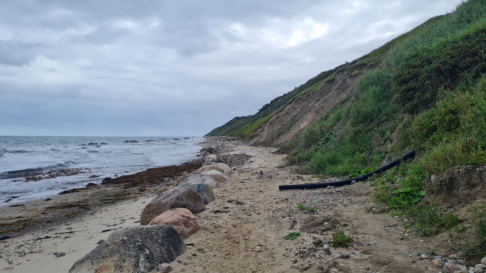| Her er hele stranden dækket af højvande, så vi måtte kravle op på skrænten.