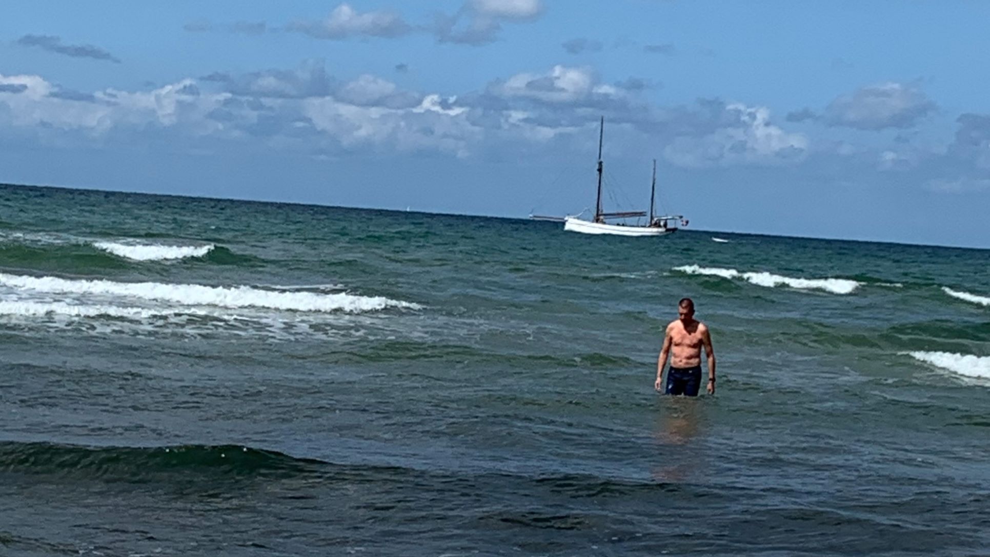 | Det var blevet rimelig varmt, så Niklas fik lige tid til en dukkert i havet, mens Lone sad på stranden og