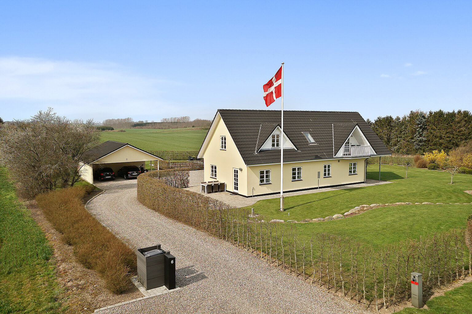 Vi lavede også en meget bred dobbelt carport på 8 meter i bredden, så der er god plads til 2 biler og en motorcykel og samtidig kan man gå tørskoet fra bilerne til entrédøren.
