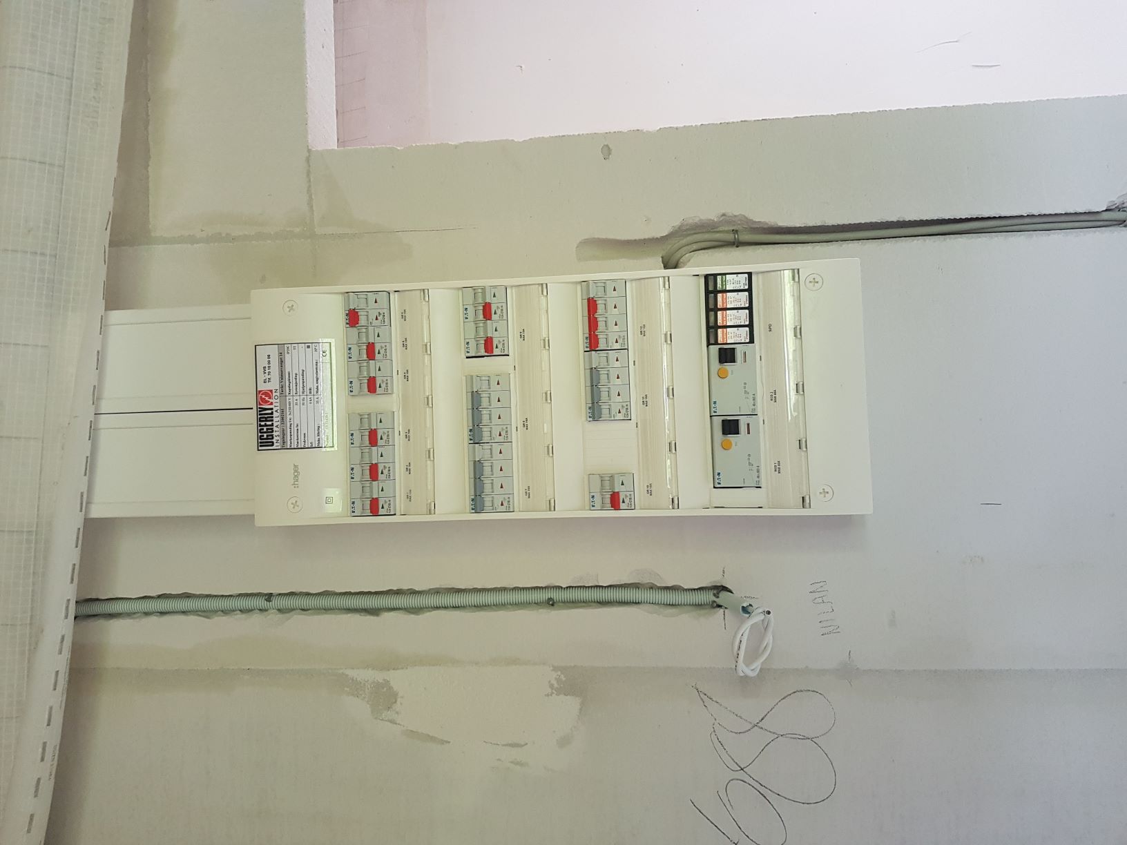 Elektrikerne har arbejdet i flere dage på at fræse ledninger ind i væggene og gøre klar til stikkontakter og eludtag. I dag blev elgruppetavlen installeret.