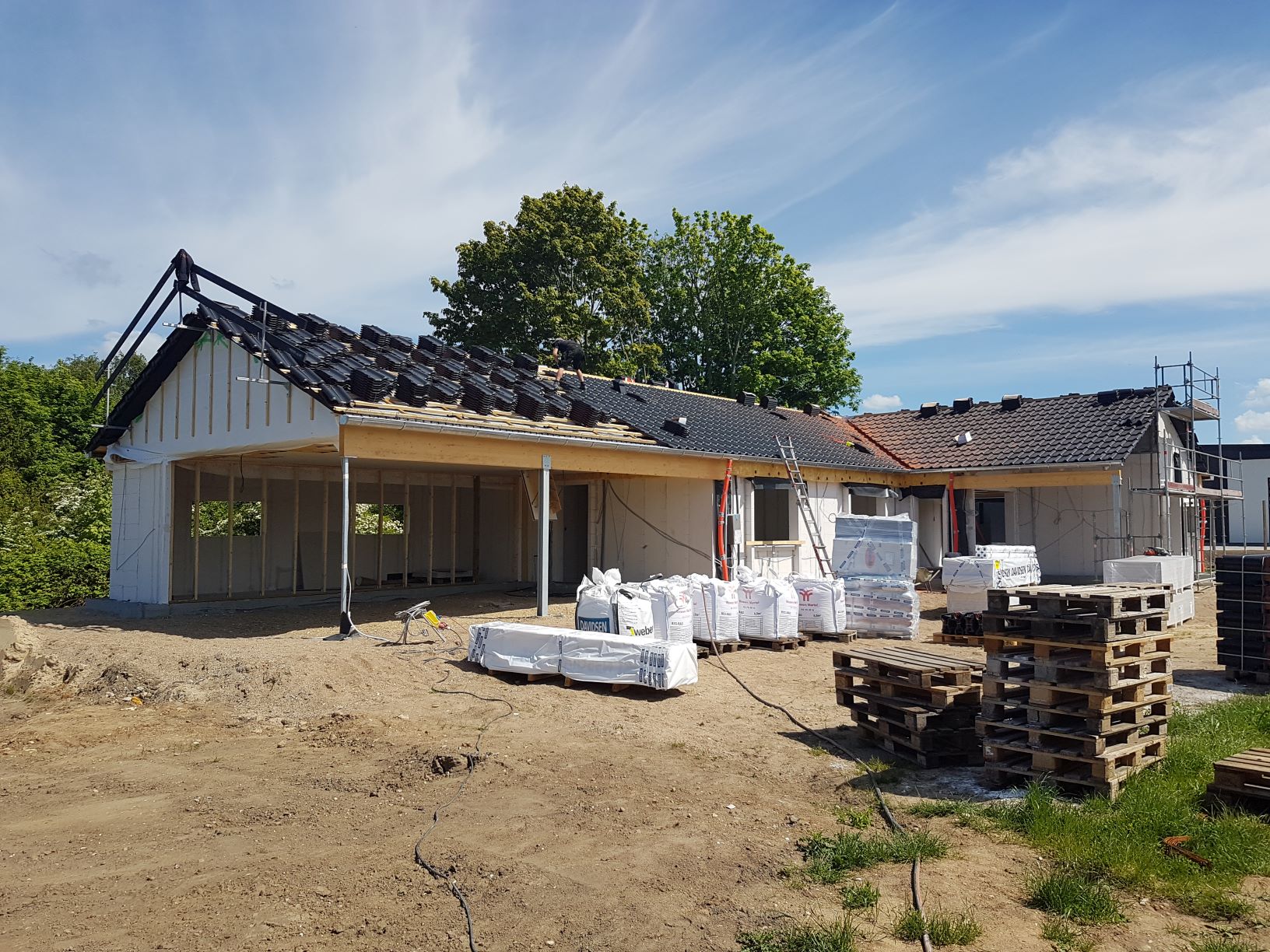 Om morgenen kl. 08:00 torsdag den 28. maj startede 2 friske taglæggere fra Jylland med at bære stakke med tagsten op på taget.