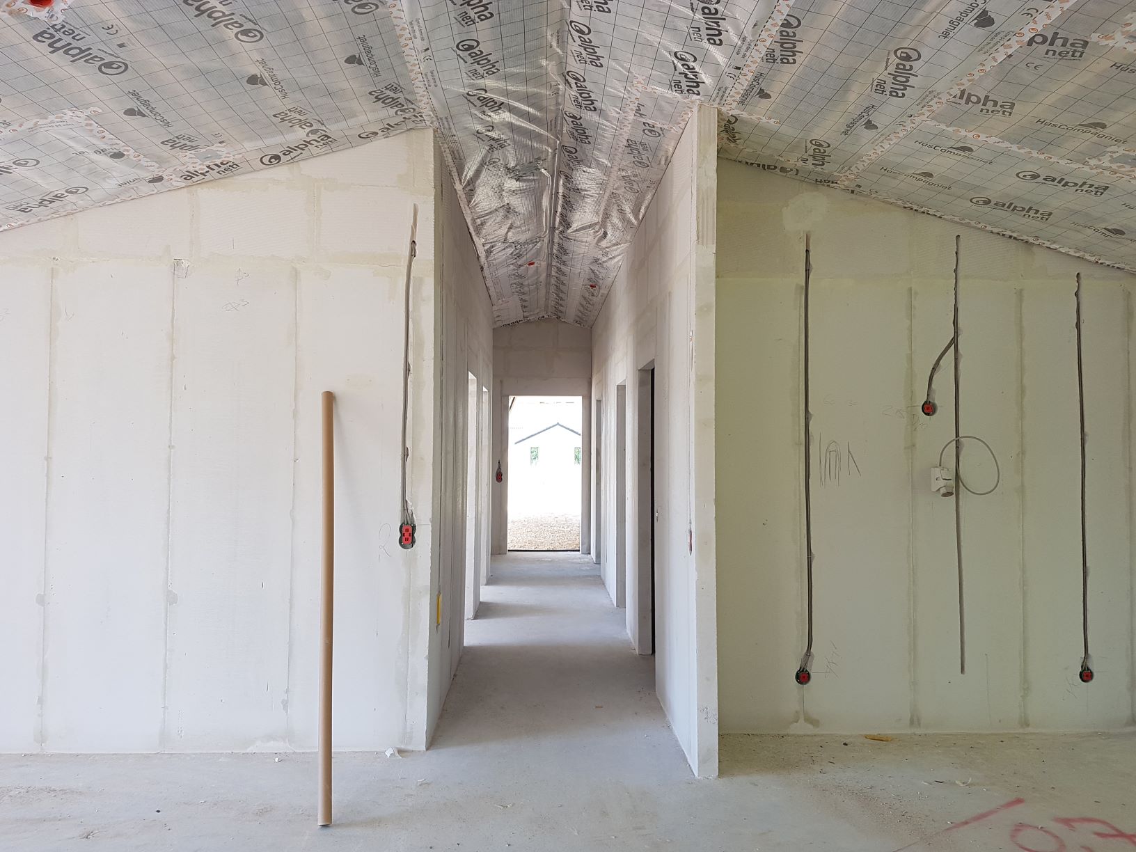 På grund af Corona er der normalt kun én type håndværkere i gang i huset ad gangen, men mens murerne arbejder udenfor, er håndværkerne også i gang inde i huset.
