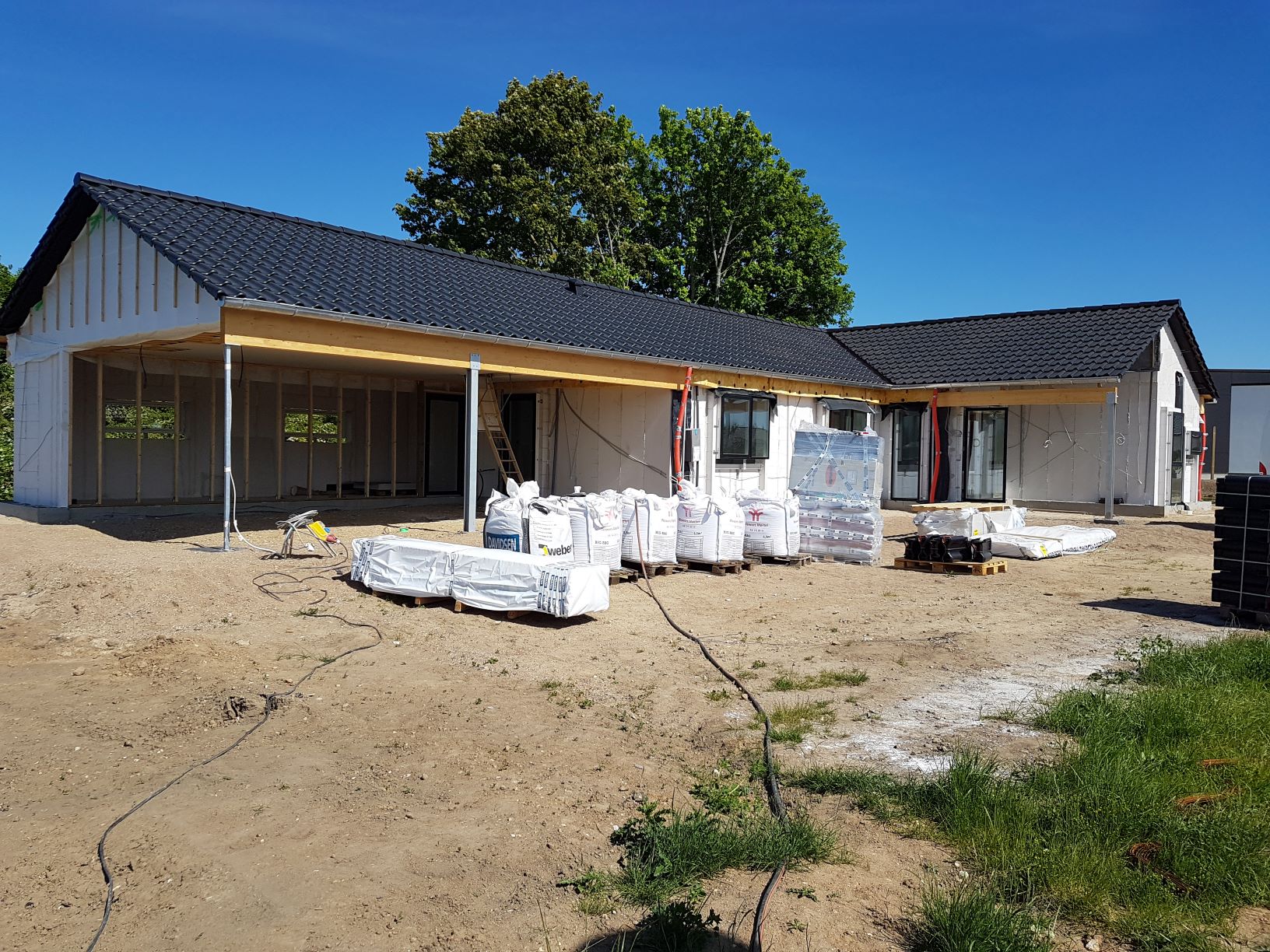 Nu er limtræsbjælkerne ved carport og terrasse malet, så huset er færdigt udefra, og der er ryddet næsten op med byggematerialer og emballage.