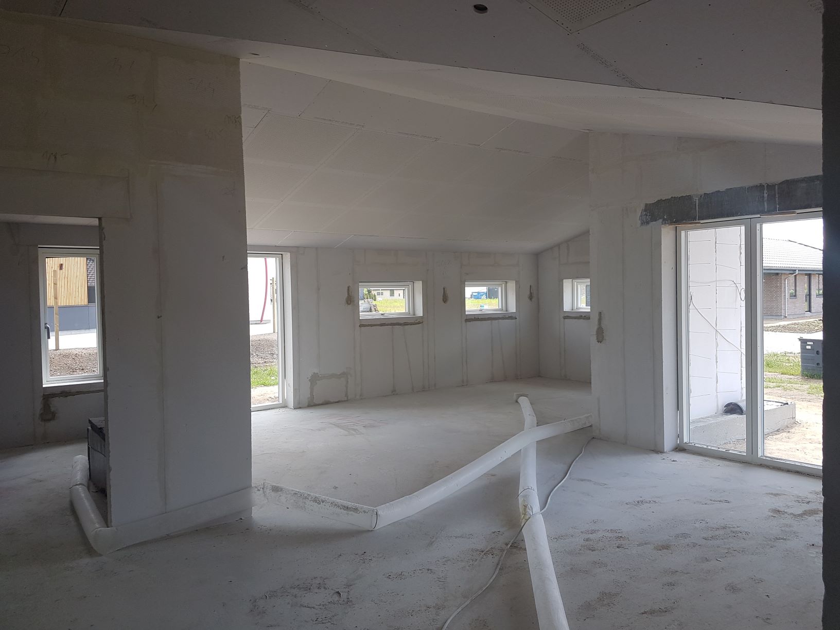 Indvendigt blev de færdige med at sætte gipsplader op i loftet. Vi har valgt akustiklofter i stue og køkkenalrum, hvor der er loft til kip.