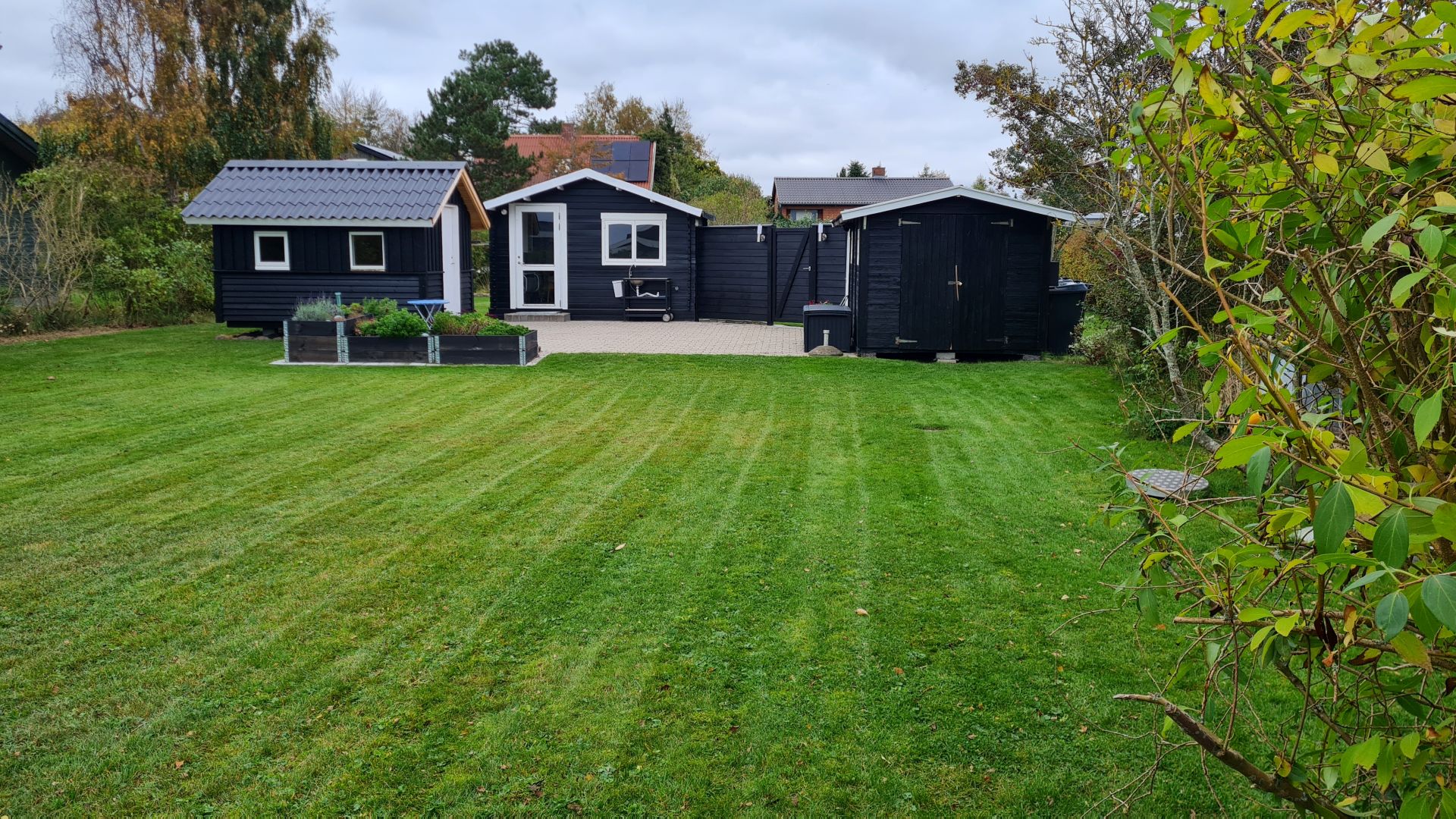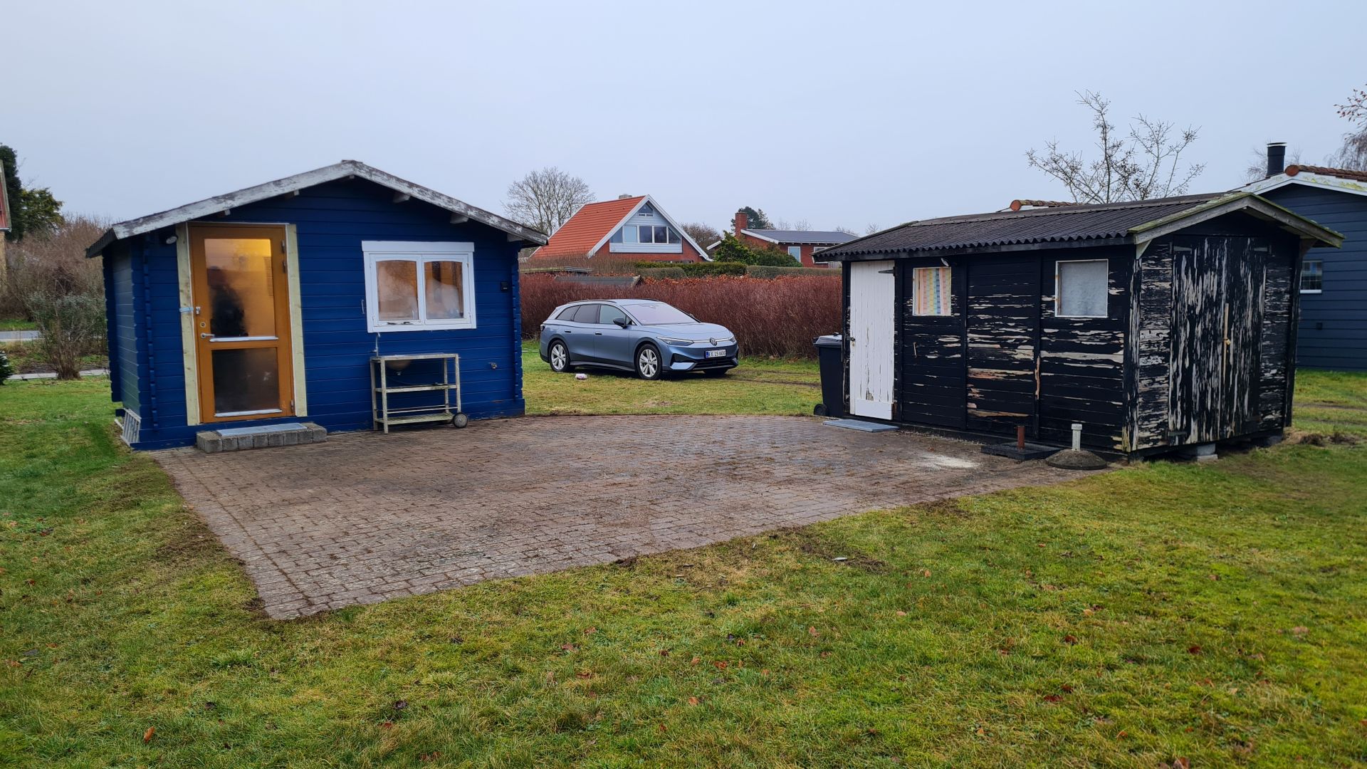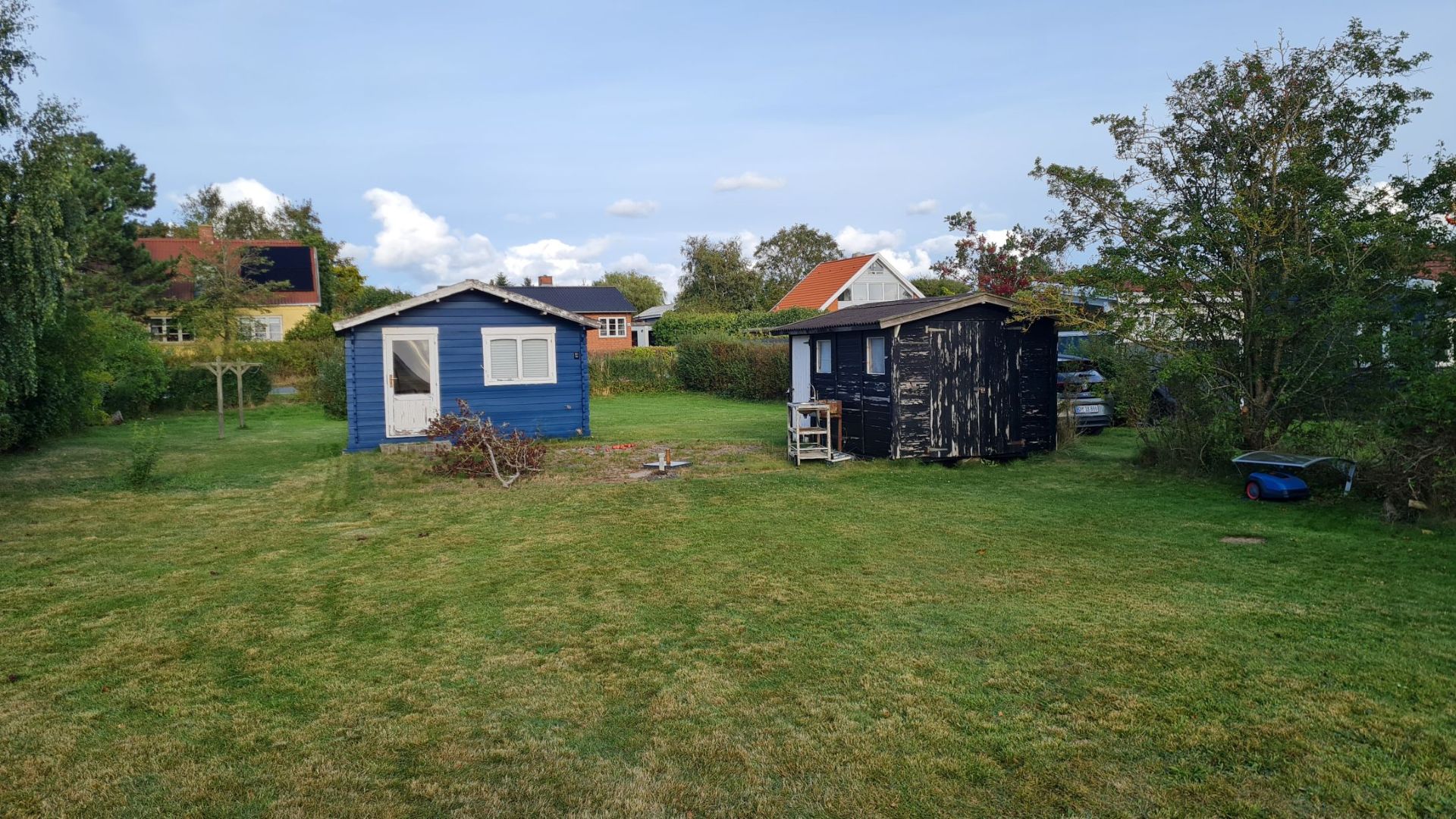 Grunden har en god størrelse på 800 kvm, og der lå to faldefærdige skure, hvoraf det ene (det "sorte" til højre) var perfekt til at have vores paddleboards i.
