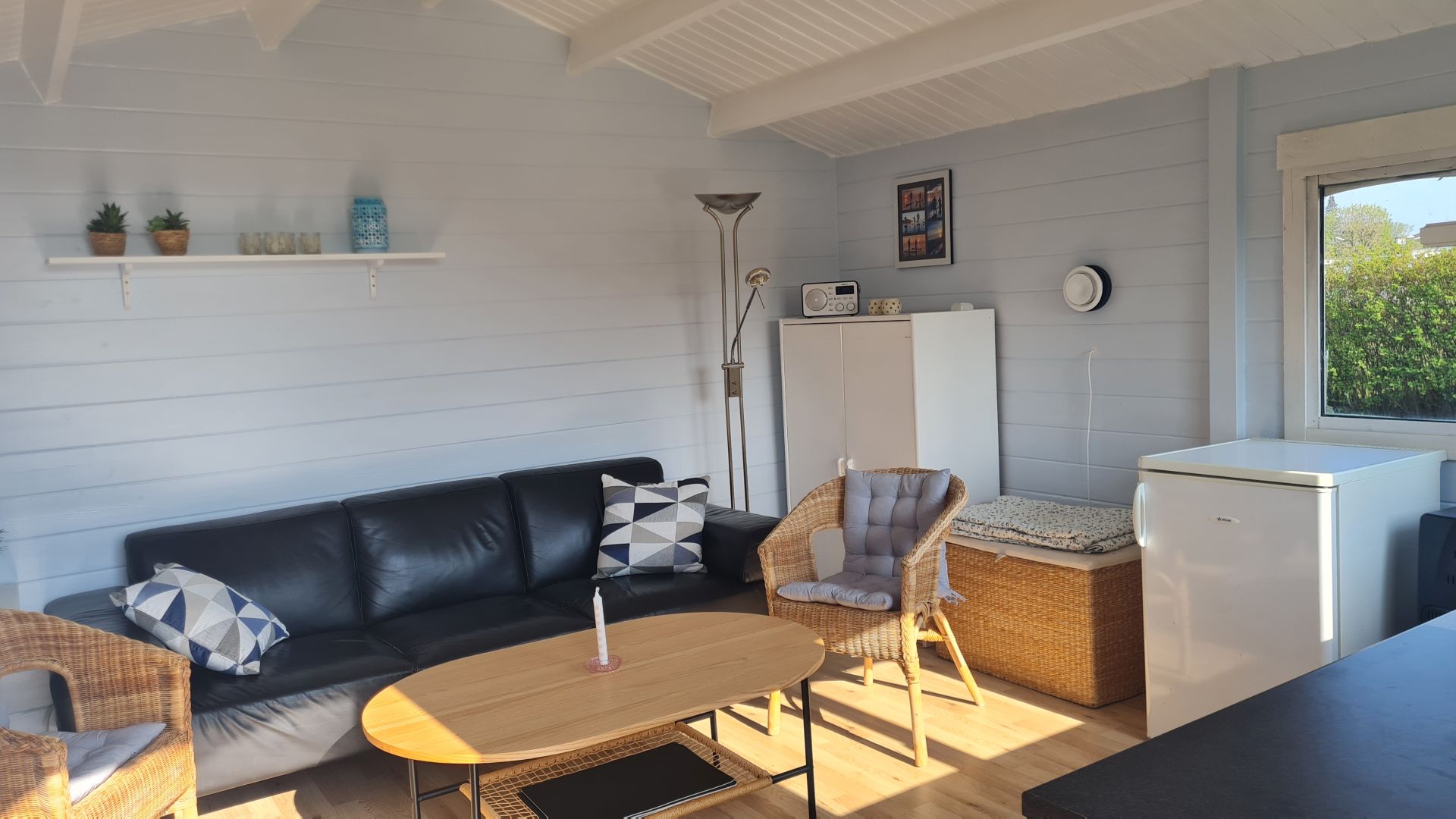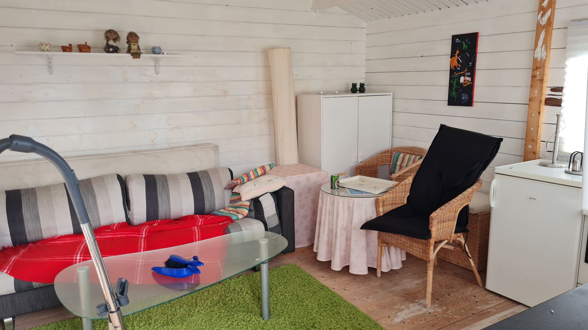 I den lille bjælkehytte på omkring 16 kvm. er der plads til en lille sofa i den ene ende. Det kræver vist lige en god fantasi, lidt nye møbler og en