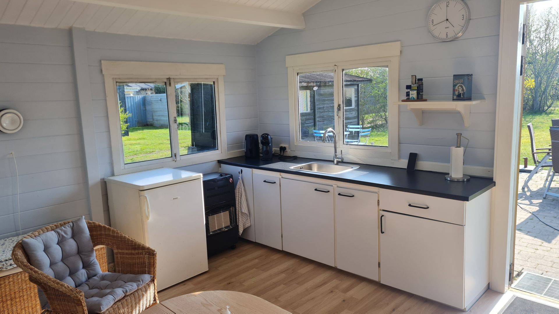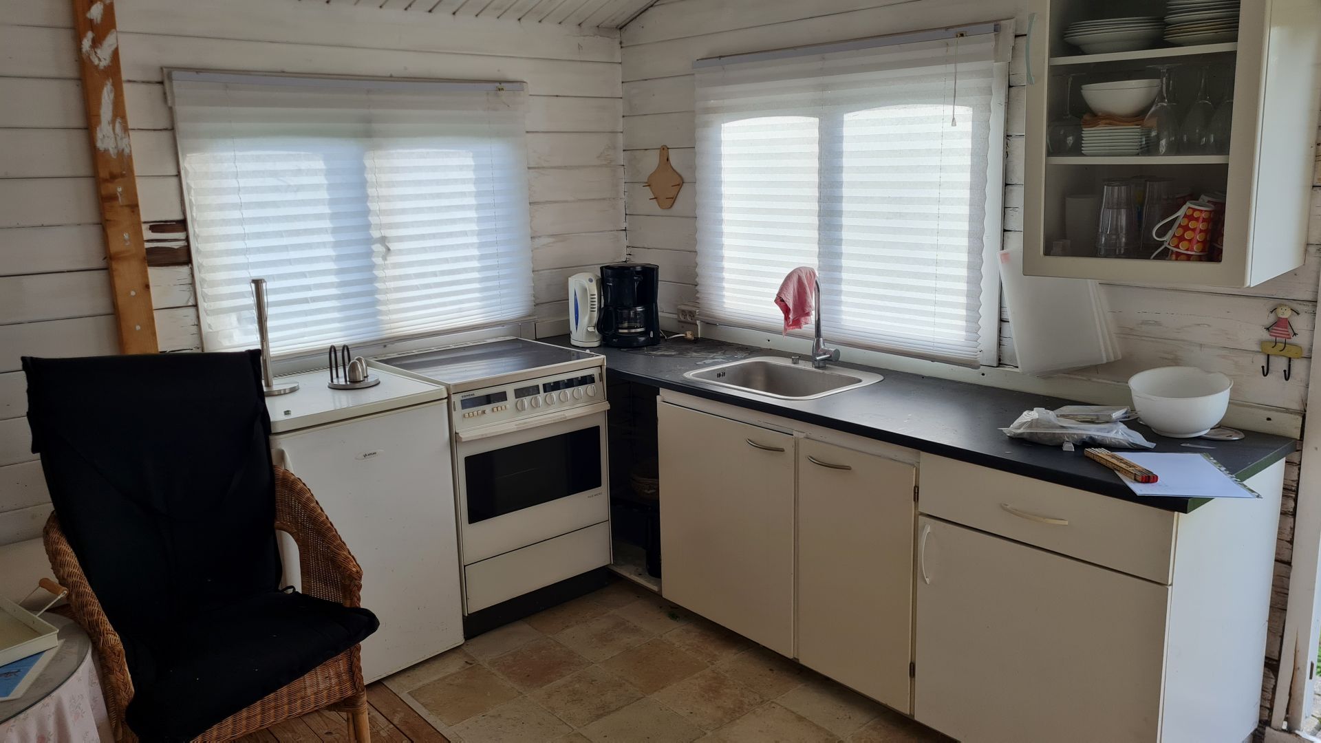 I den anden ende - ud mod haven - er der et lille køkken. Der skal lige sættes et par ekstra køkkenlåger i til venstre, hvor der bare er hul bag komfuret (som skal kasseres), males og sættes nye, ens greb i alle låger,