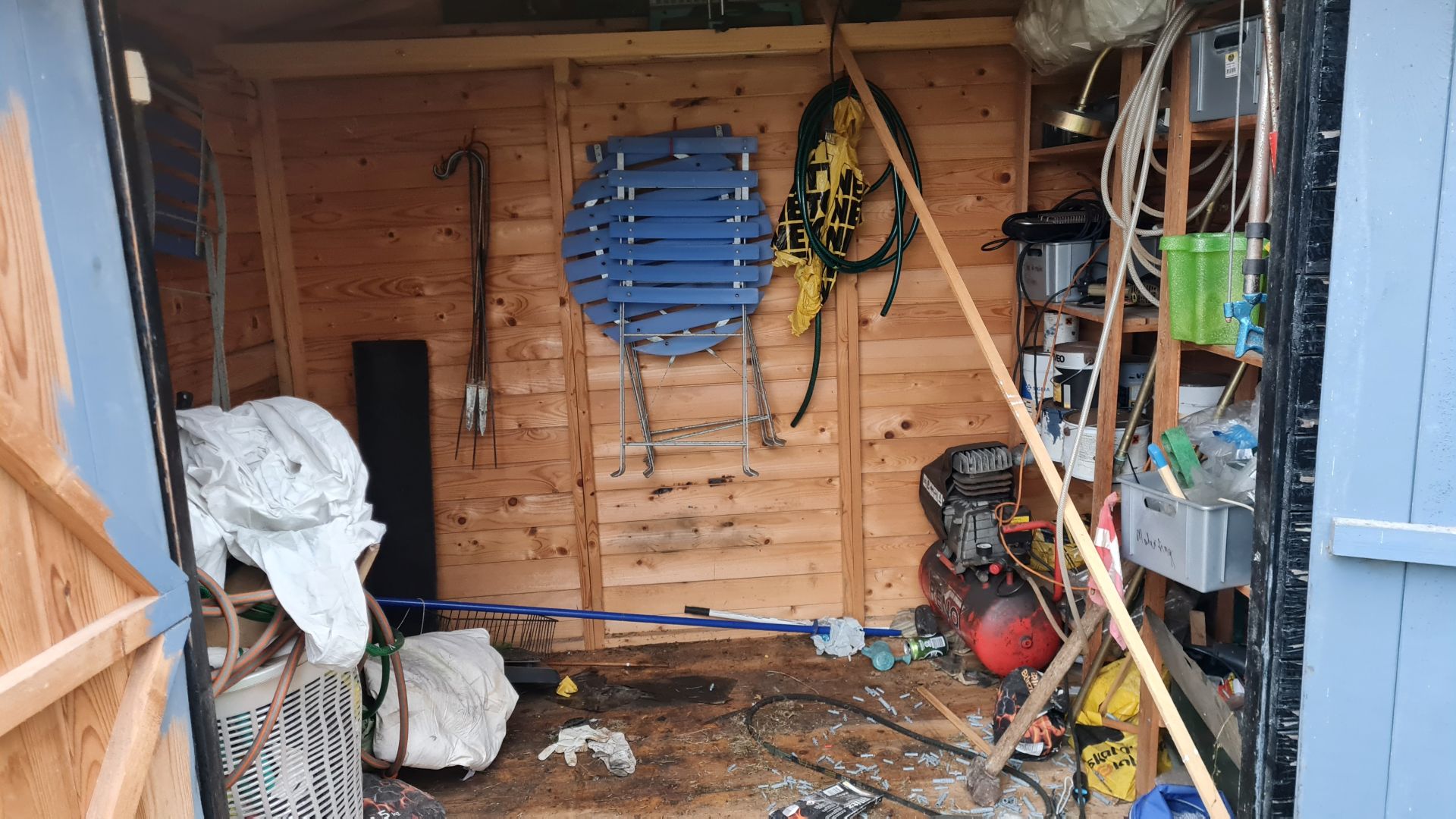 Sådan så det ud i den anden ende af paddleboarskuret. Toilettet er bag væggen i venstre side, og i højre side laver vi hul, så vores paddleboards kan ligge her i længden.