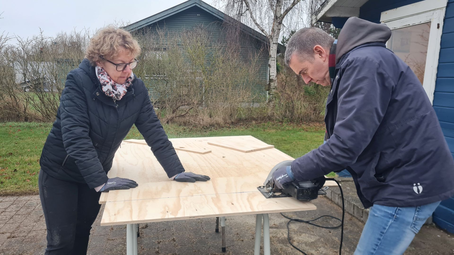 Undervejs blev vi næsten professionelle til at skære krydsfinerpladerne ud med rundsaven.