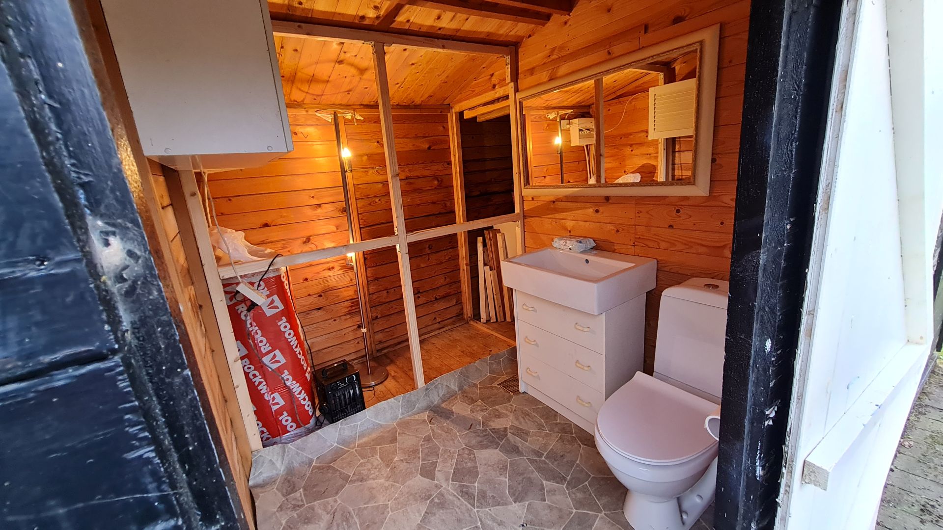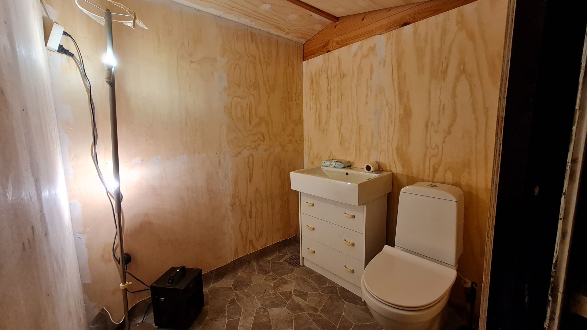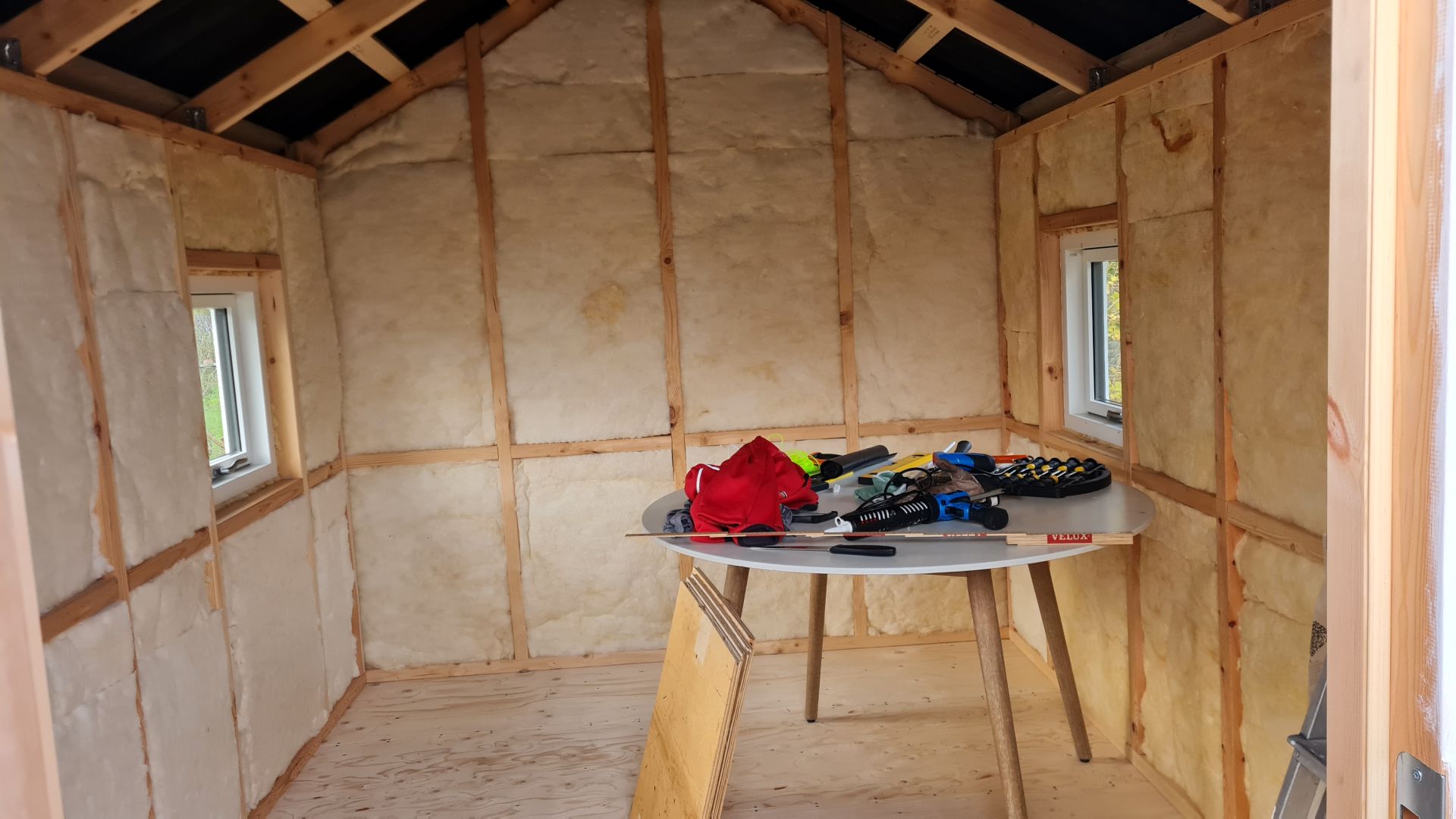 Vi er næsten færdige med at isolere og sætte krydsfinerplader op på toilettet.
