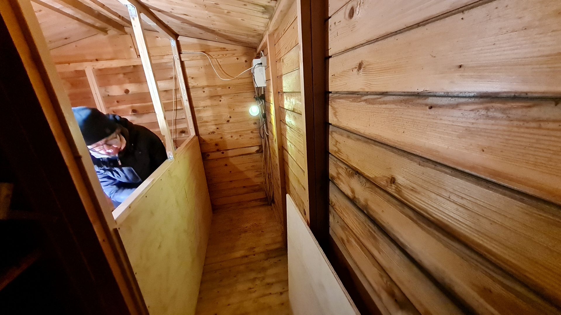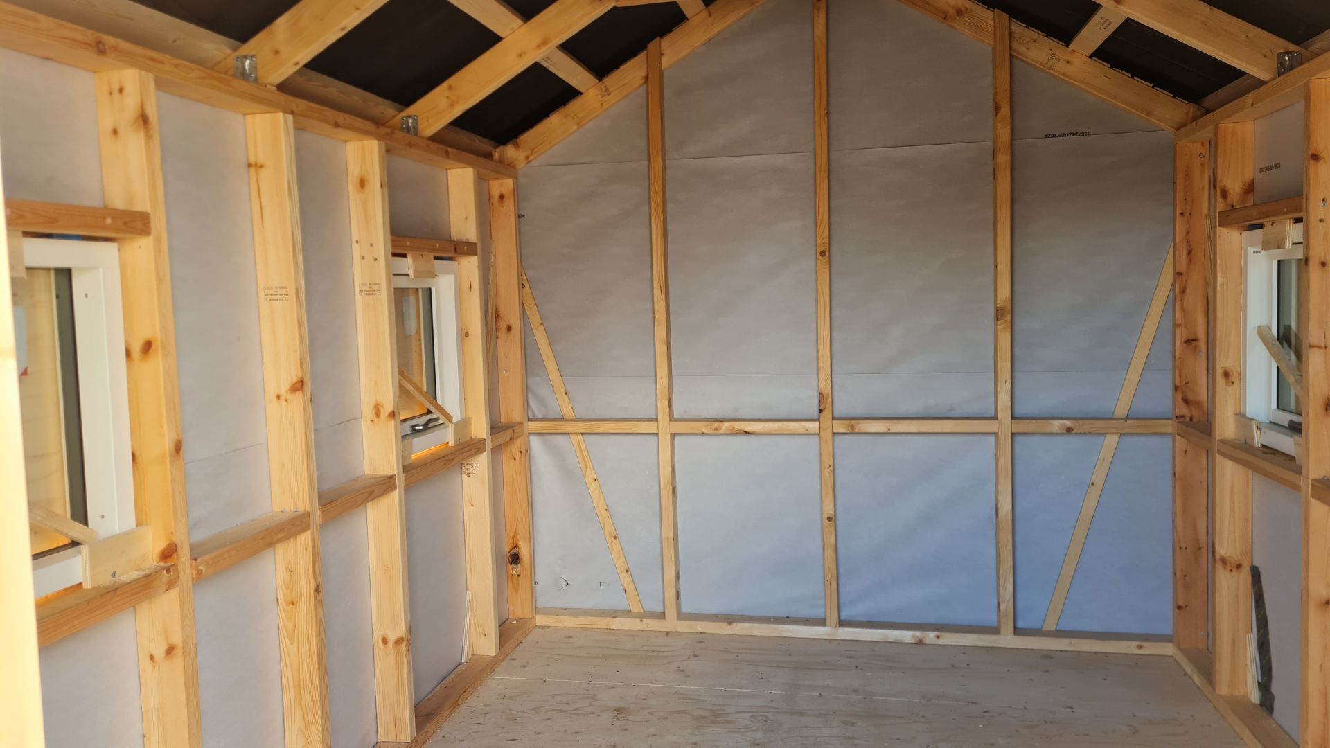 Udvendigt var bjælkehytten stort set færdig med fire termoruder (to som kan åbnes og to med fastkarm), isoleret dør og 120 mm isolering i gulvet, men indvendig kræver det lige lidt knofedt, inden vi kan bruge det som soveværelse.