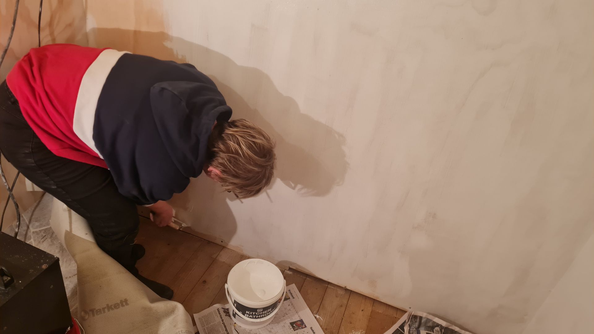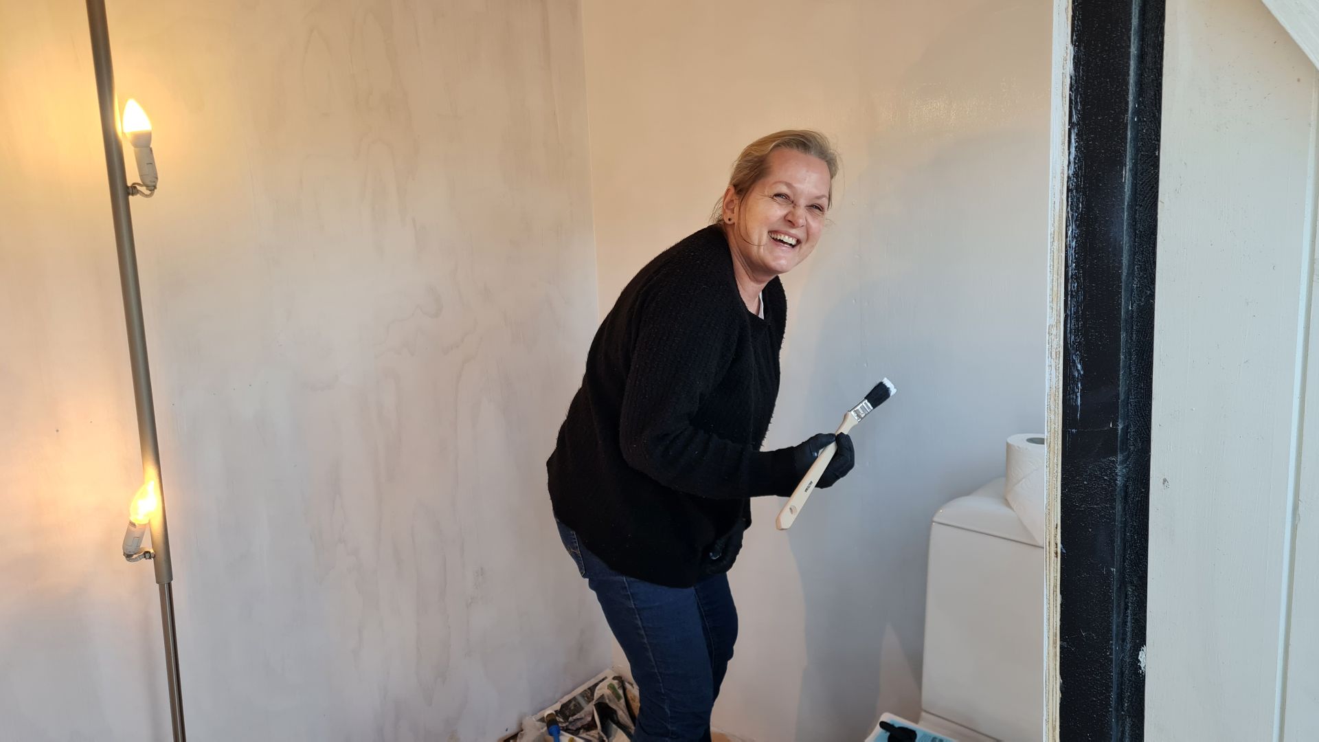 Heldigvis skulle vi ikke gøre det hele selv, men har fået hjælp af en masse gode venner og veninder. Her er det vores løbeveninde Susanne, som er med nede og male på toilettet.