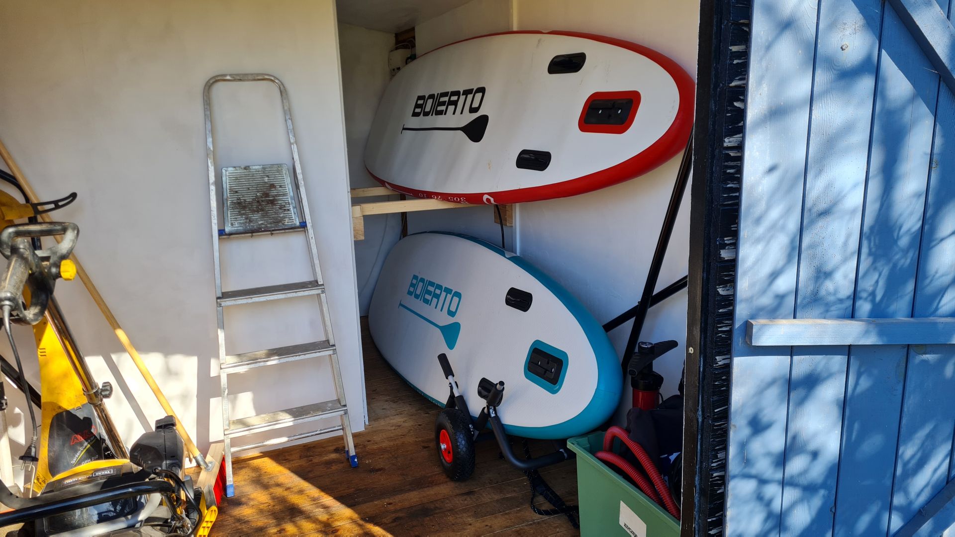 Det er ikke blevet til lige så meget, siden vi flyttede ind i huset, da det er lidt bøvlet at skulle pakke paddleboardene ind i bilen, køre til stranden et sted, pumpe boardene op og stå lidt på dem, for så at skulle lukke luften ud af dem igen, pakke dem sammen i bilen, køre hjem, pakke dem ud af bilen, vaske og pakke sammen i skuret osv.