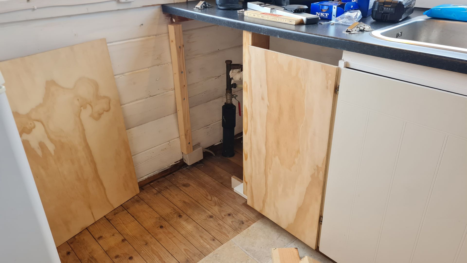Med hjælp af nogle rester af krydsfinerpladerne og lidt reglar fik vi lavet et par ekstra køkkenlåger.