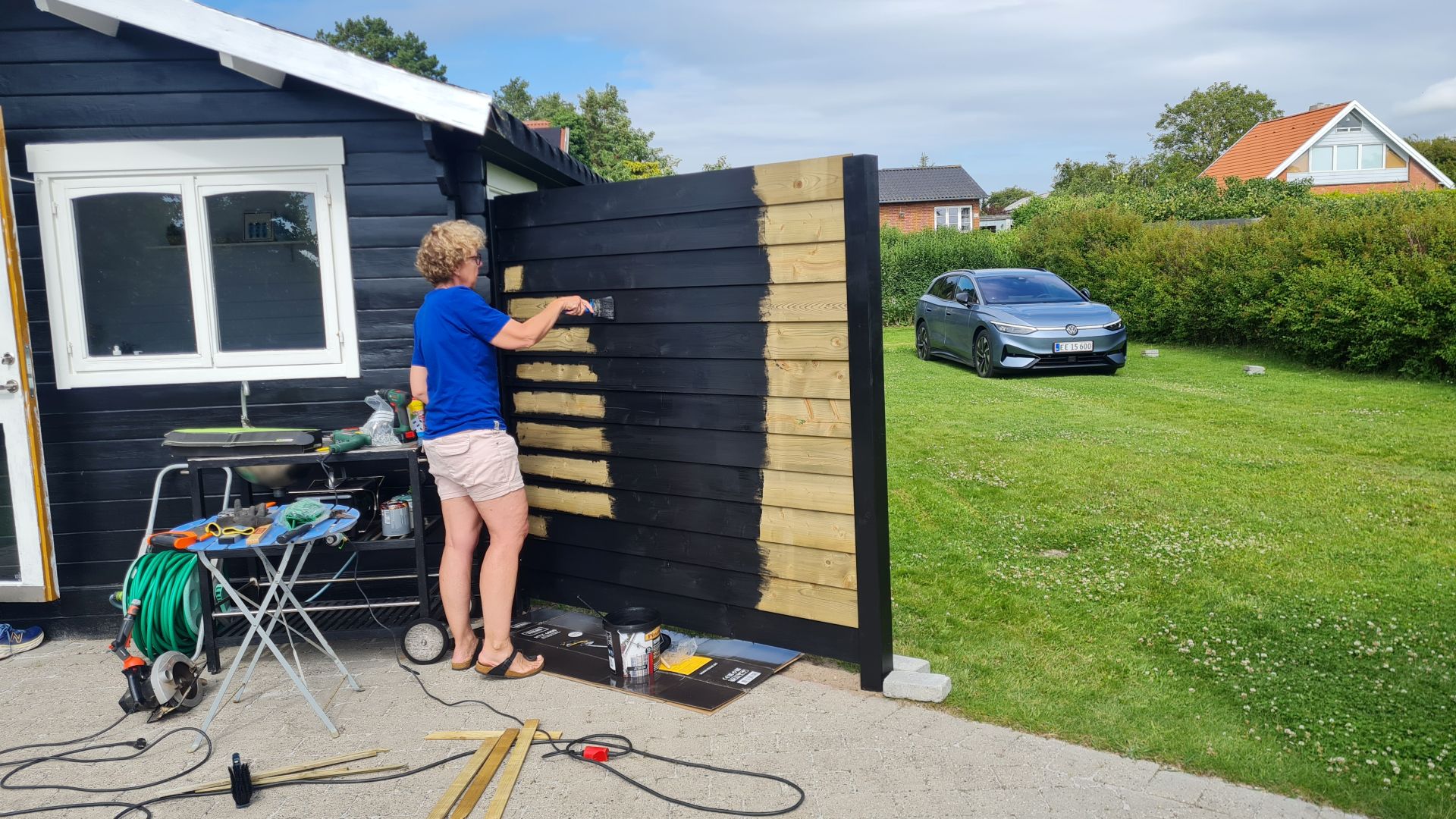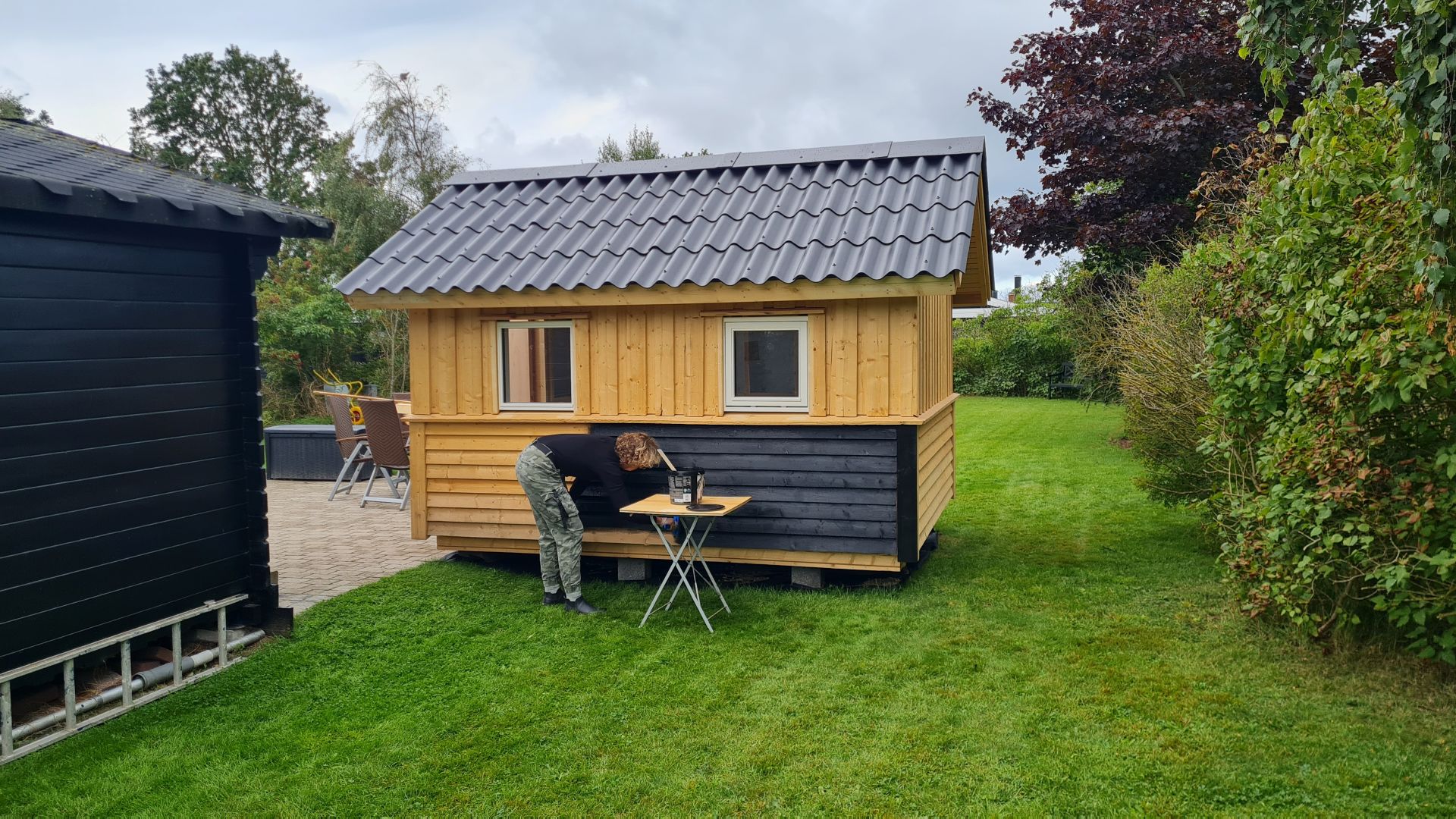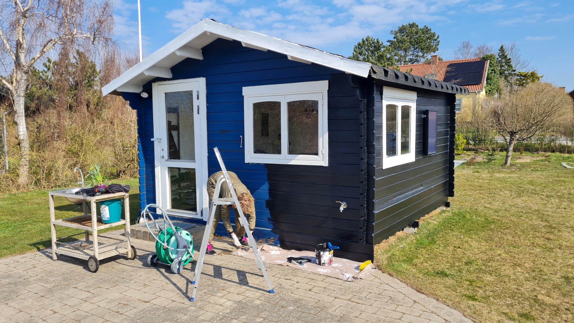 Selve sommerhuset var blåt, mens toilet/paddleboardskur var sort (eller i hvert fald sort nogle steder), så vi blev enige om, at det hele skulle males sort med hvide vinduer.