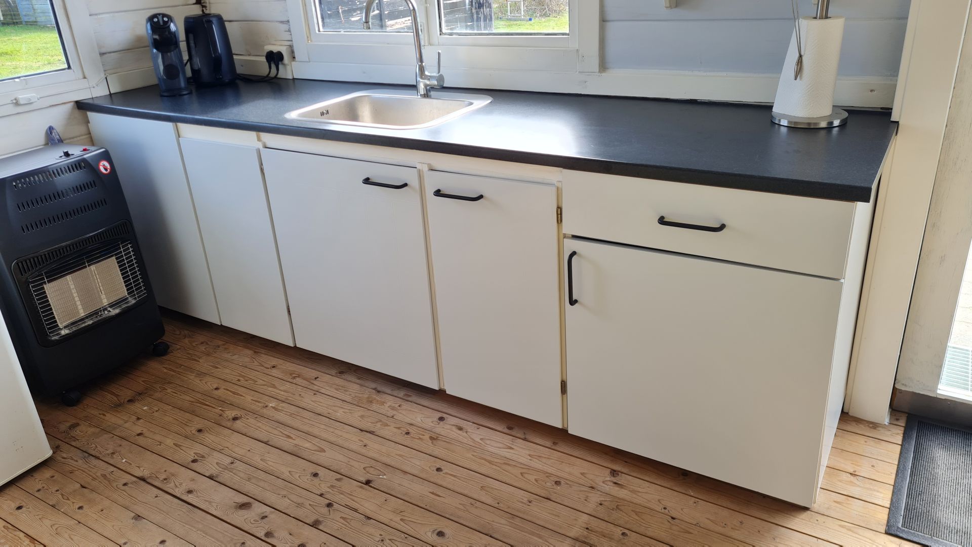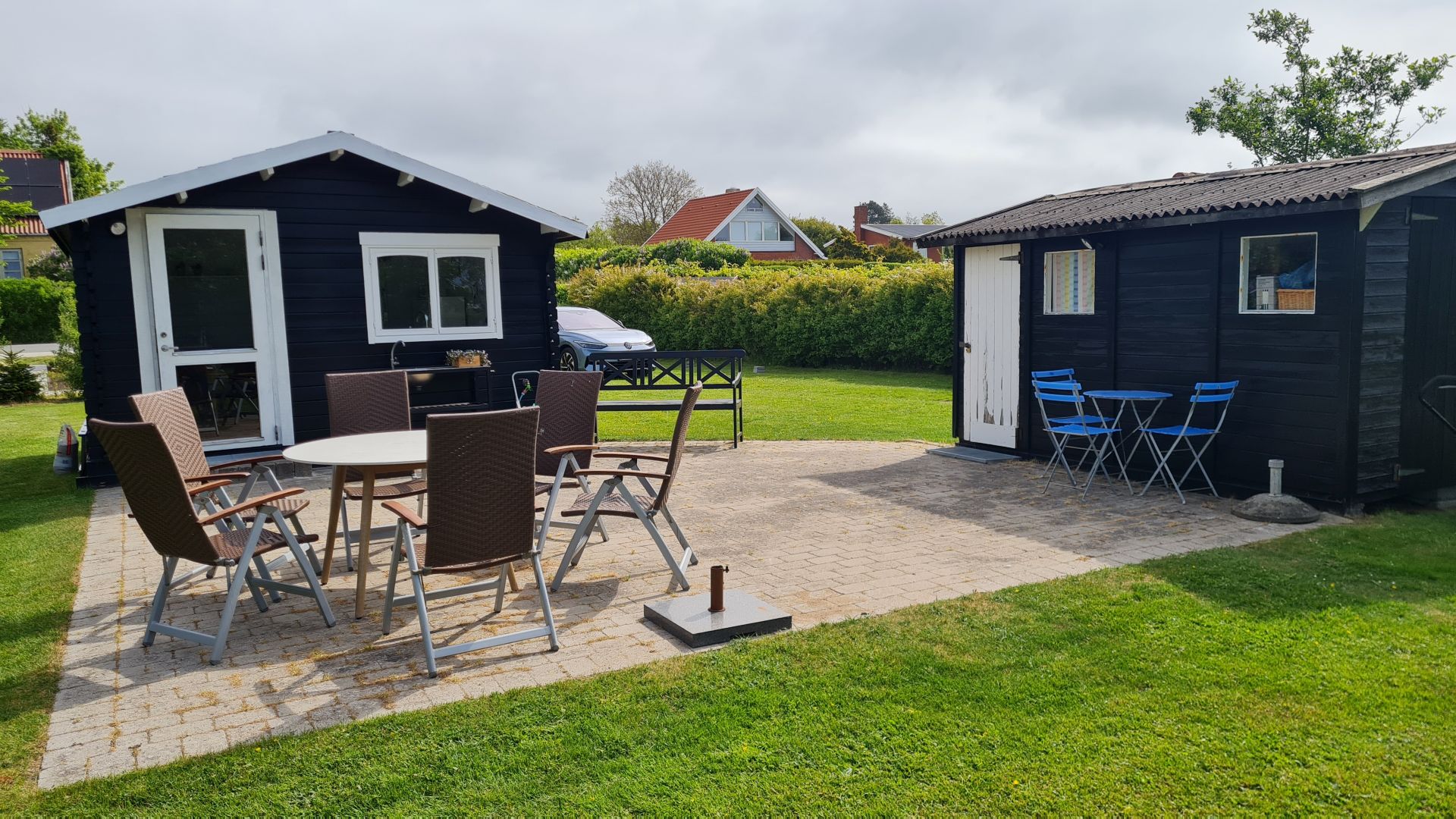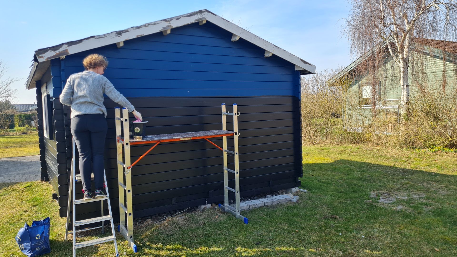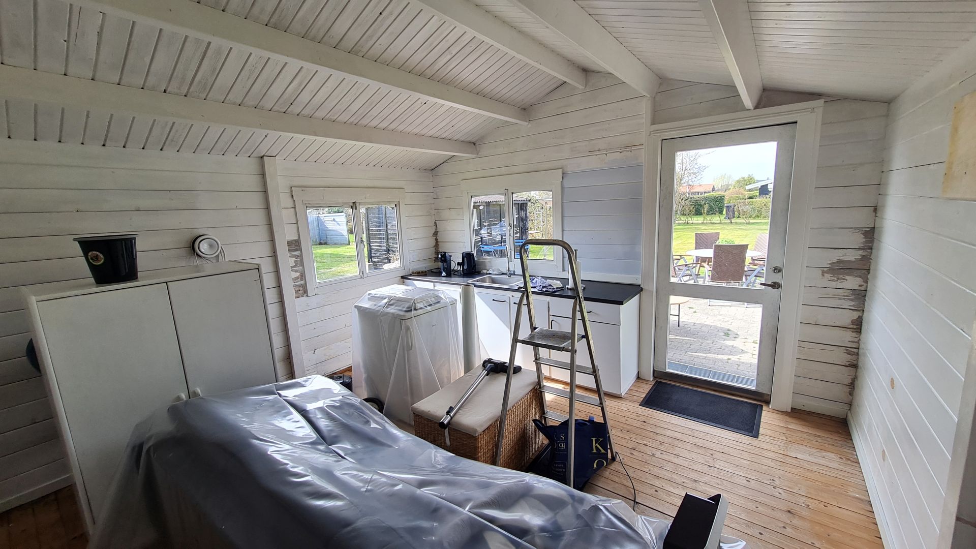 Selve sommerhuset var blåt, mens toilet/paddleboardskur var sort (eller i hvert fald sort nogle steder), så vi blev enige om, at det hele skulle males sort med hvide vinduer.