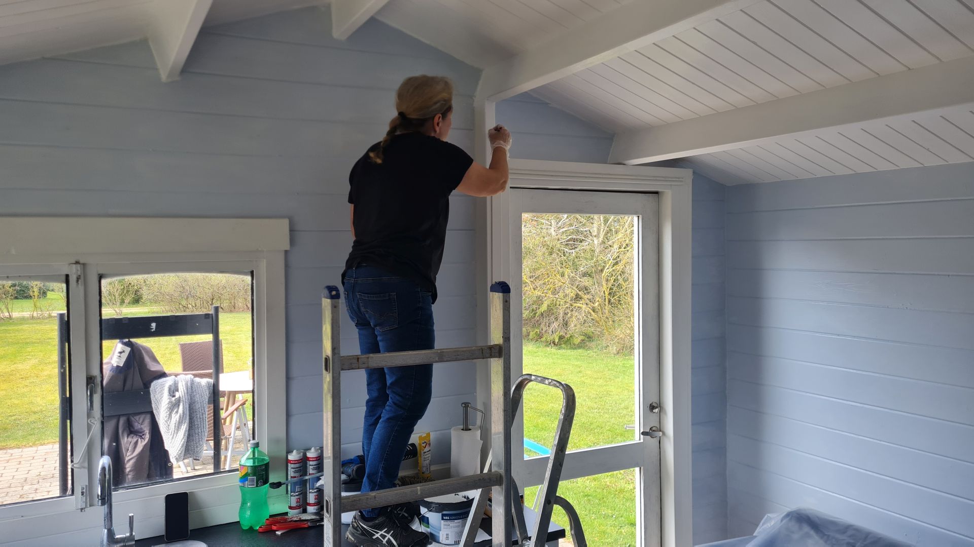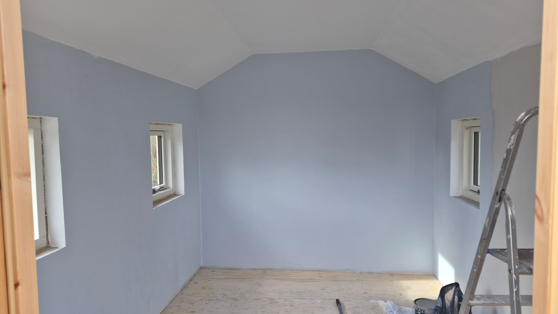 Marts 2026. Nu er vi godt i gang med at male. Vi har valgt de samme farver som i hovedhuset: hvidt loft og lyseblå vægge.