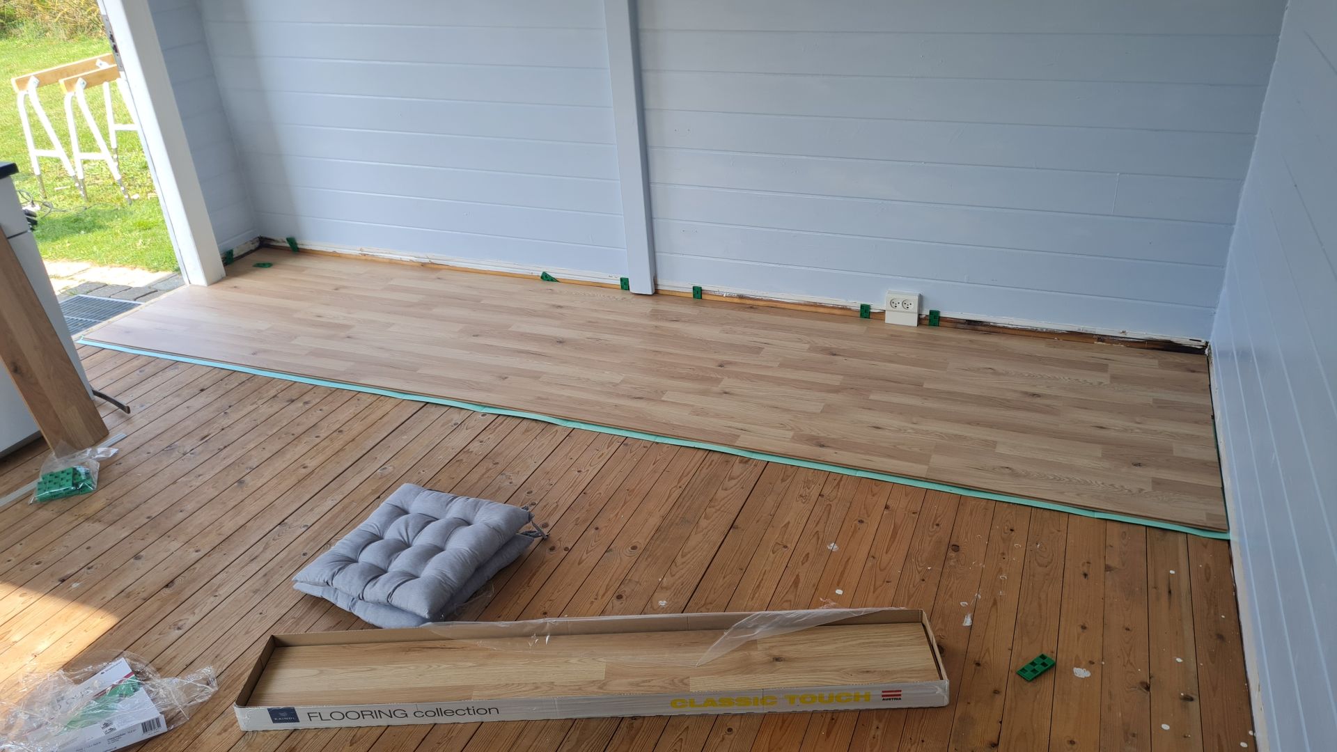 Ved et af vores utallige besøg i byggemarkedet faldt vi over et super billigt klikgulv, som vi blev enige om var en meget hurtigere og billigere løsning.
