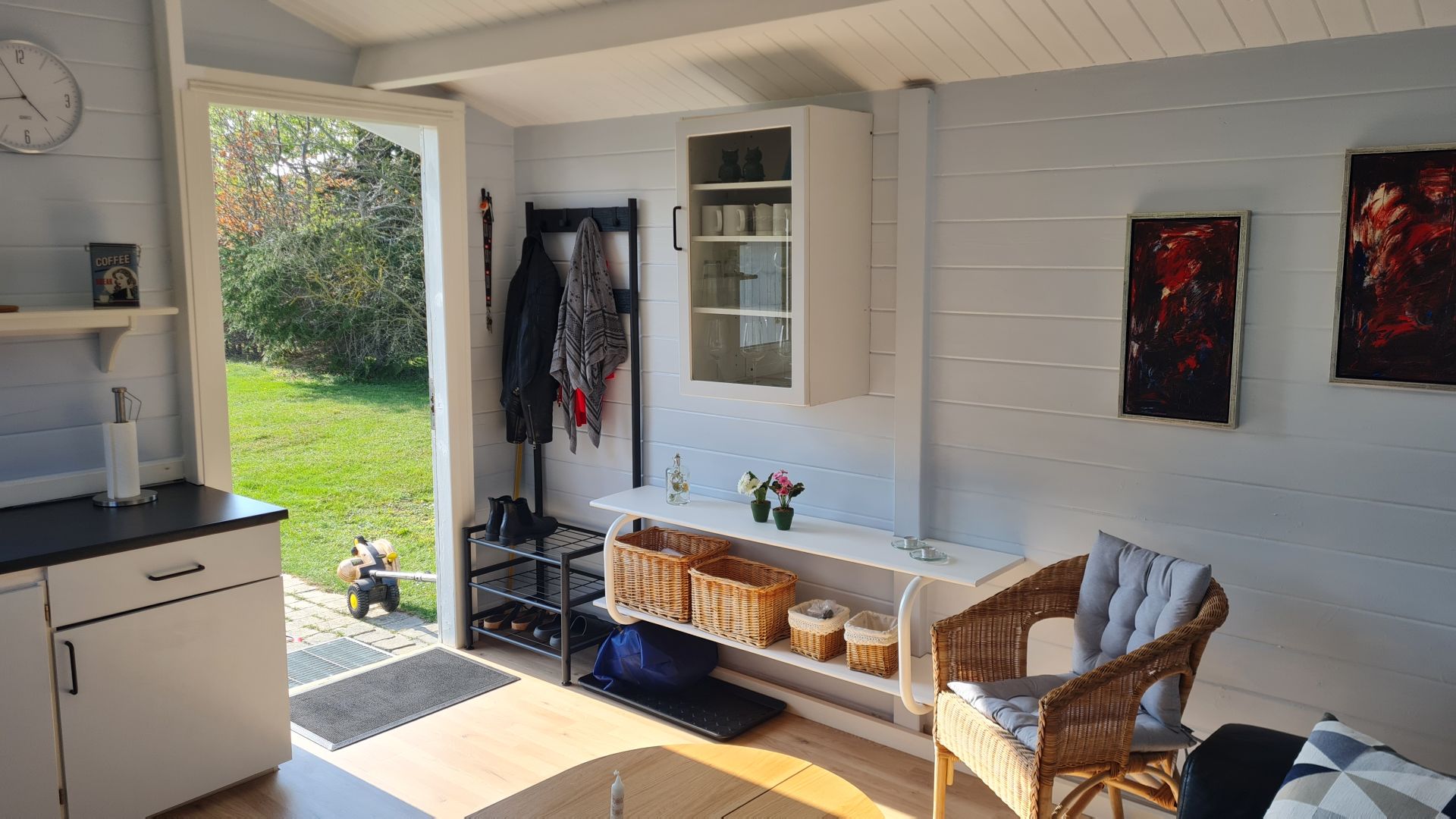 Vi fik også købt en lille knagerække og skohylde, som passede fint ind ved døren.