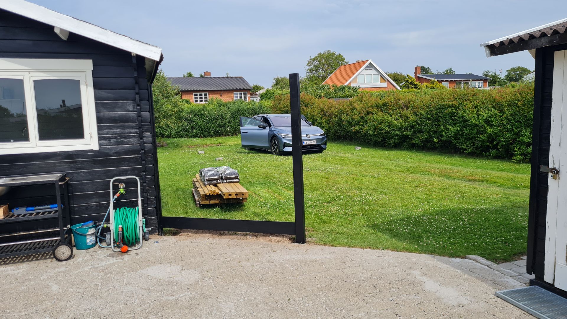 Én ting har vi lært: Der er altid nye projekter i et sommerhus. Vi ville gerne sætte et hegn op mellem de to huse for at skabe lidt læ på terrassen og lukke af ud til vejen.
