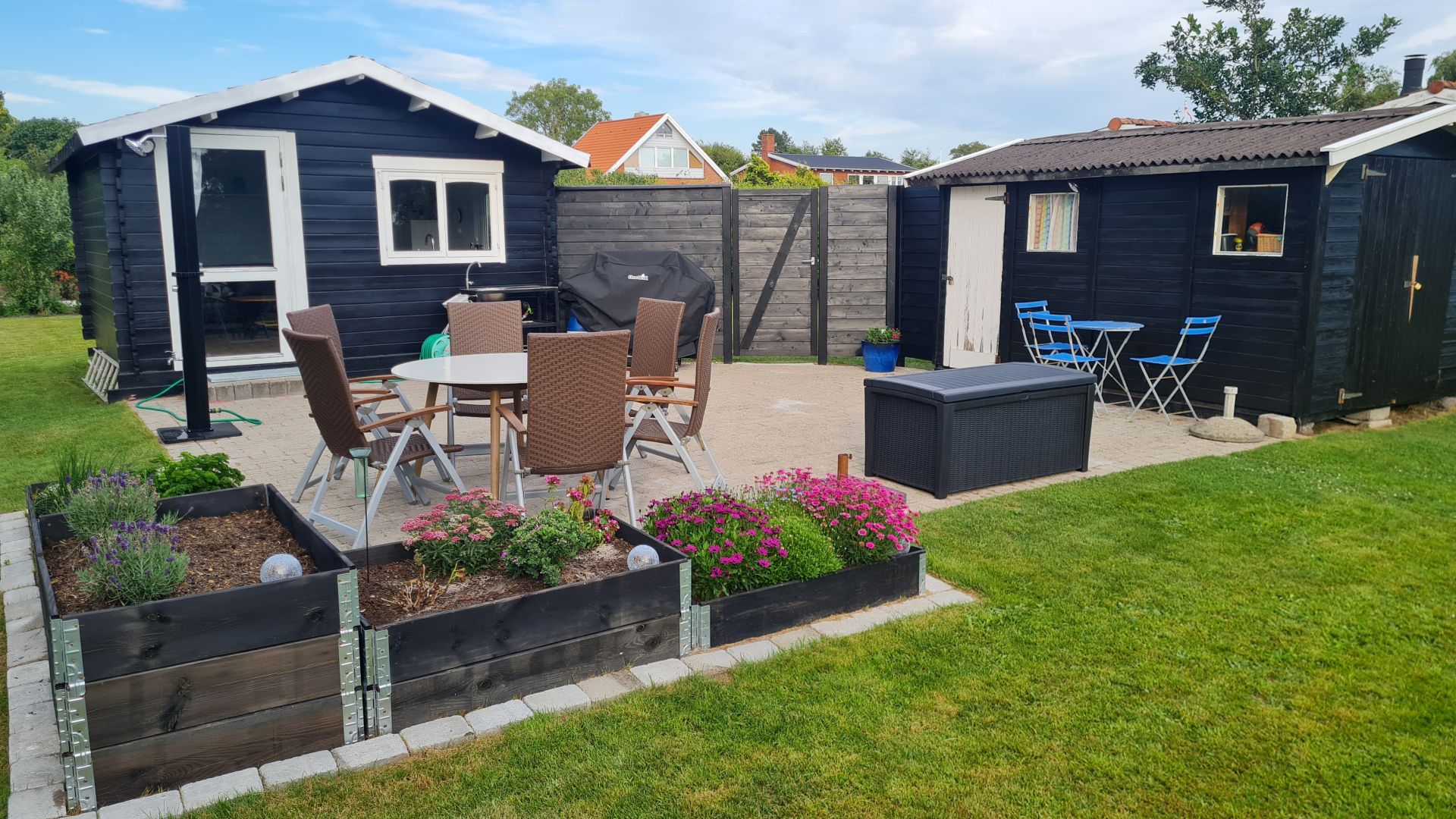 Begge huse er malet, og vi fik byttet os til et brugt havebord med seks stole for to flasker vin. Nu begynder det også at blive rigtig fint udenfor, og vi kan forestille os mange hyggelige