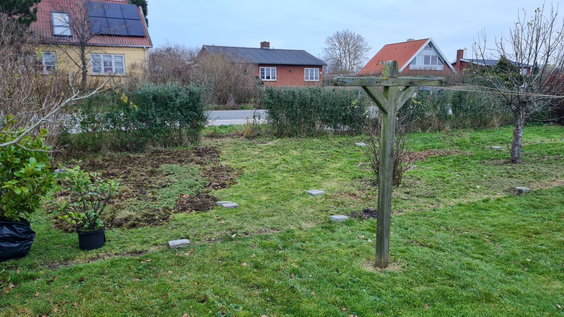 Vores grund ligger ud til Bildsøvej, hvor der er en del trafik, men grunden er jo dejlig stor på 800 kvm og aflang, så vi vil lave et plantebælte med forskellige træer og