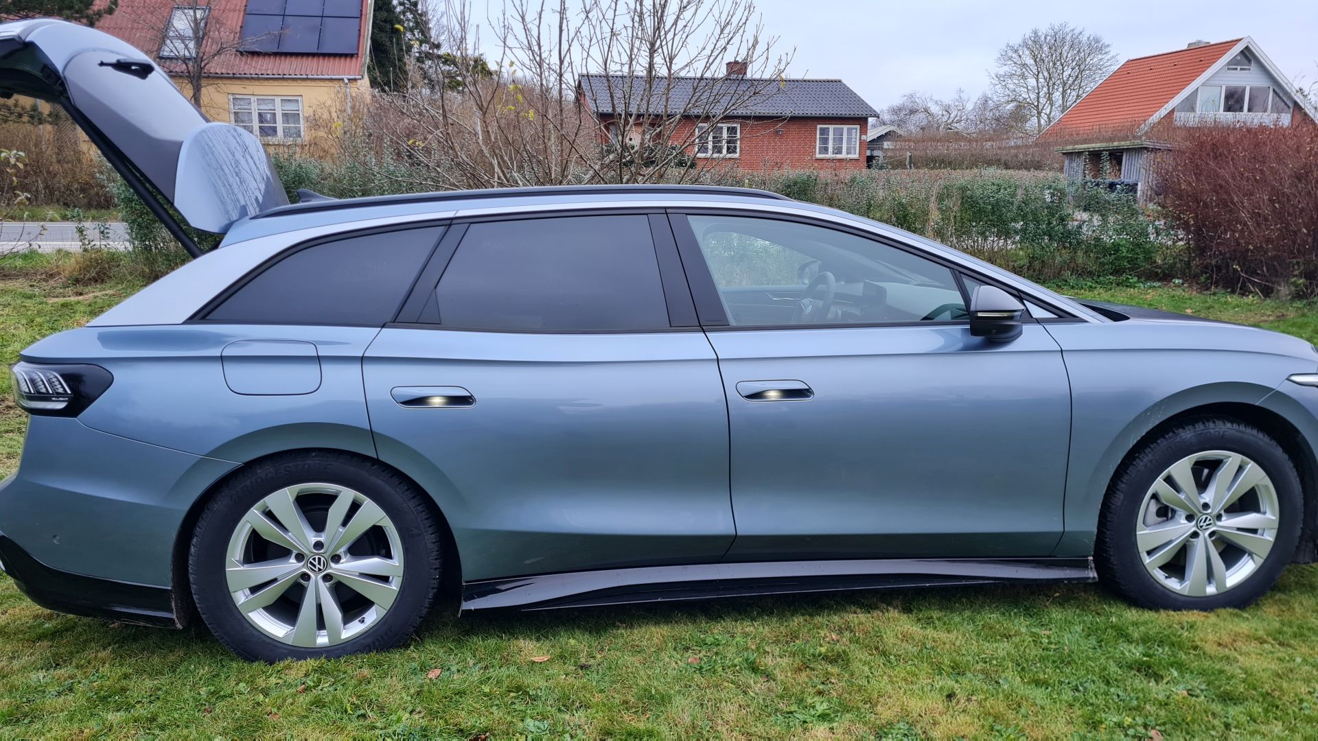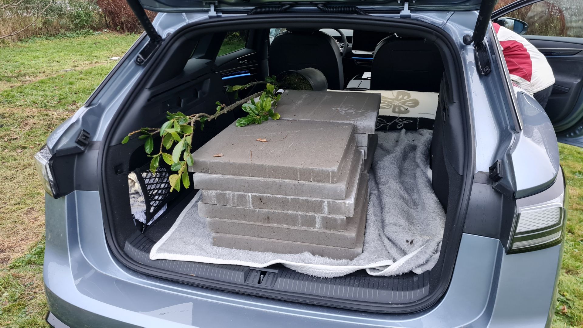 Vi skulle bruge 36 stk. 50x50 cm fliser, så da Niklas havde en fridag, kørte han sammen med Susanne ud og købte fliser. Der kan ligge 12 fliser ad gangen i sådan en ID.7'er, så det blev klaret med tre ture til byggemarkedet.
