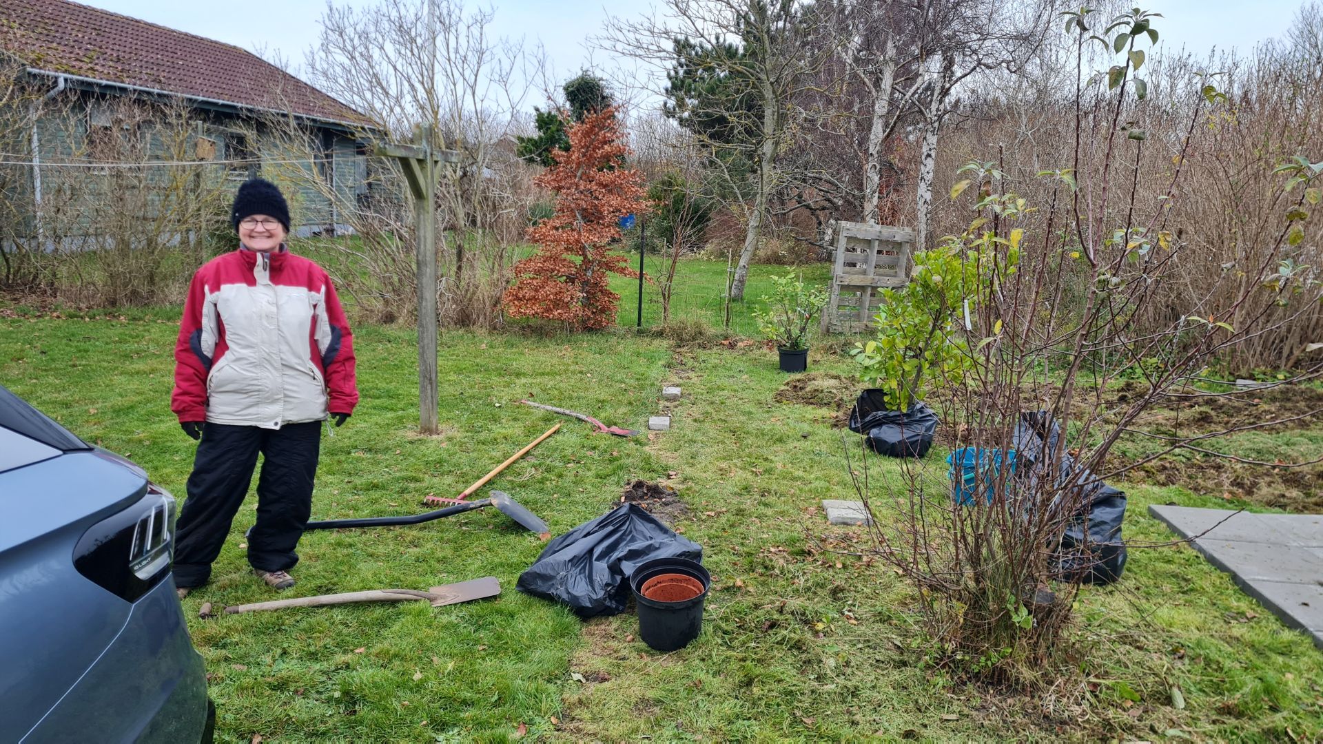 Gitte Lynge kom også forbi igen og hjalp med at plante en hel masse blomster og mindre buske, som vi havde købt billigt.