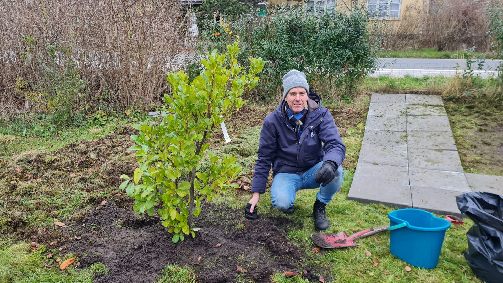 Med fliserne lagt løst ud på jorden det rigtige sted, kunne vi begynde at plante lidt buske rundt om flisegangen.