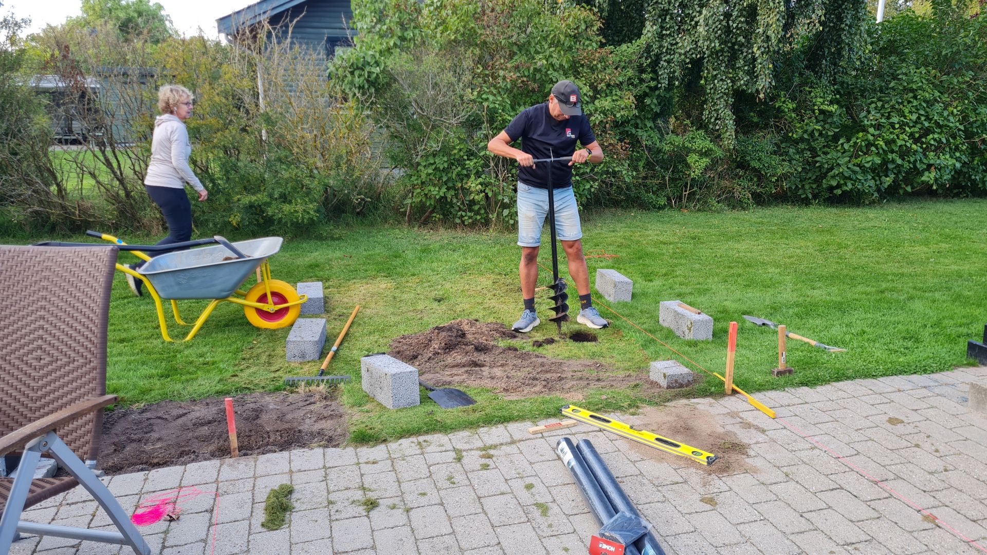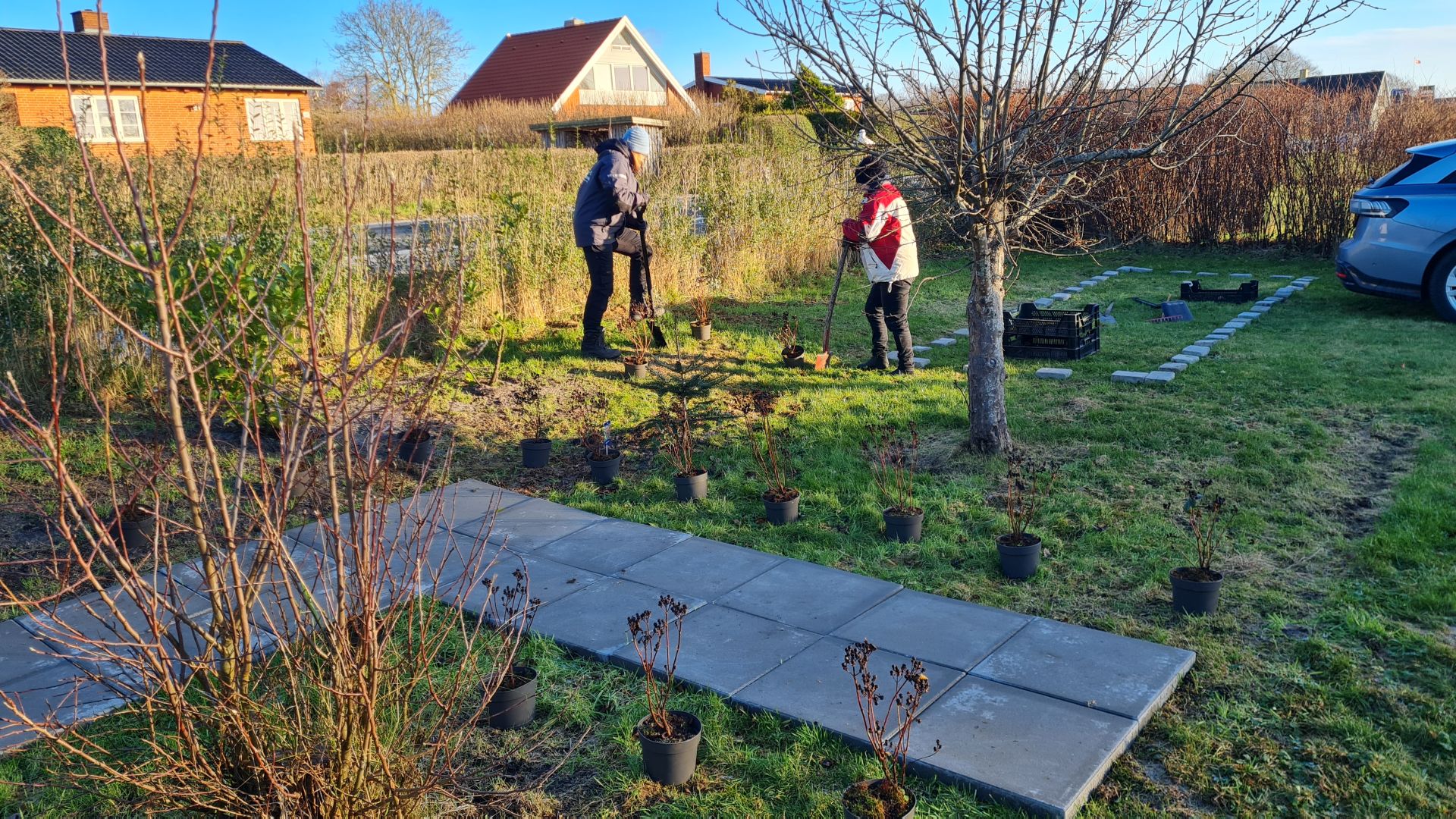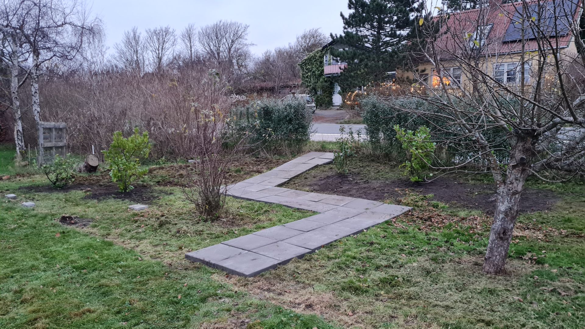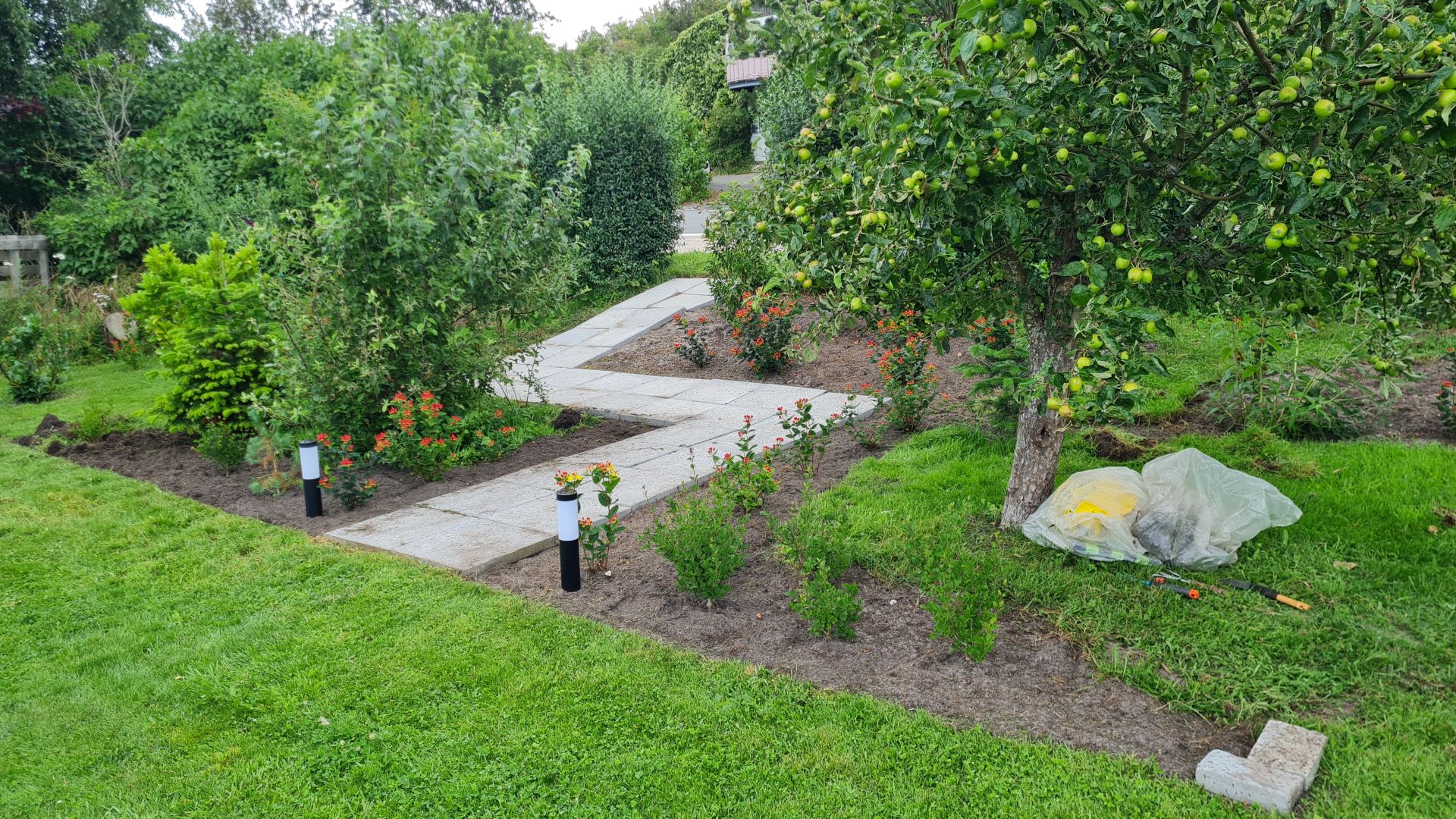 Så er alle fliserne lagt ud til havegangen, og de første buske er plantet.