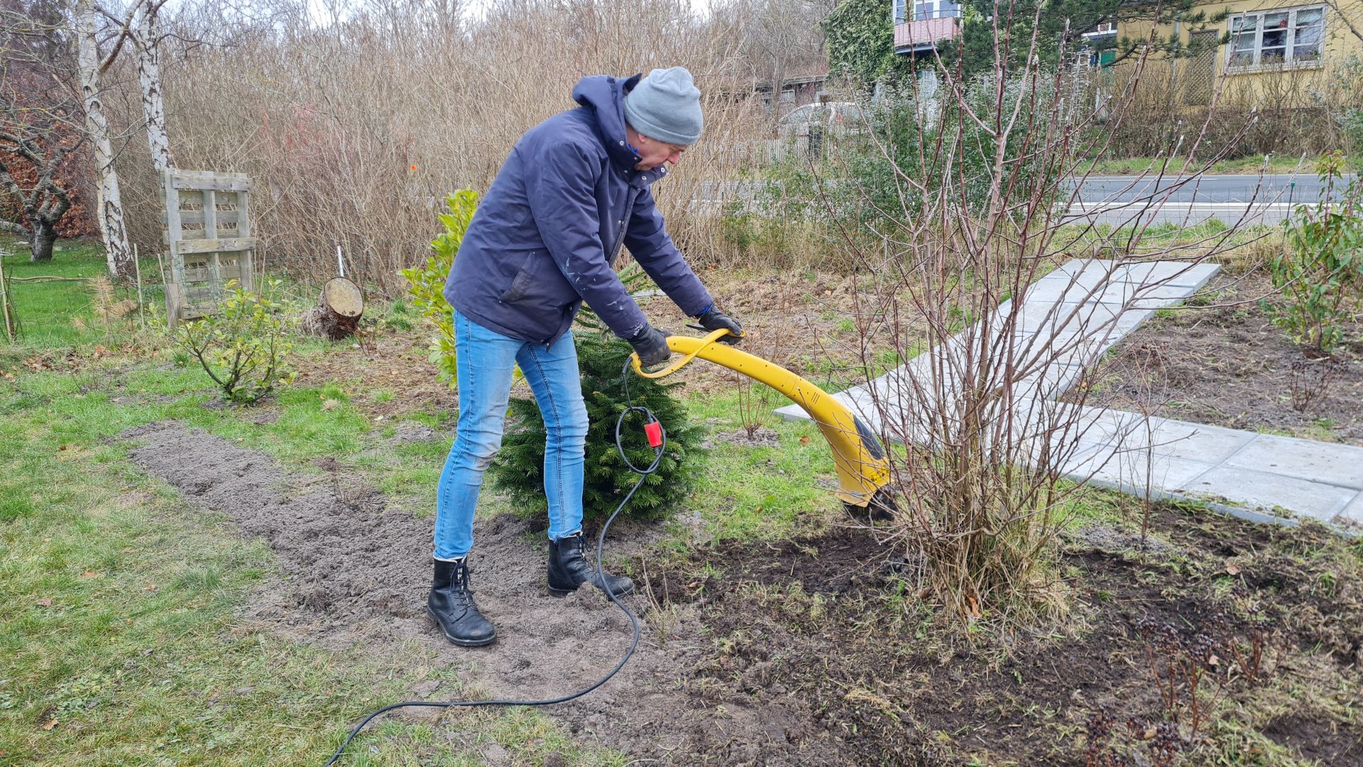 Inden vi begynder at plante buske, vil vi derfor lægge fliserne til en snoet havegang, så vi kan se, hvor vi kan plante.