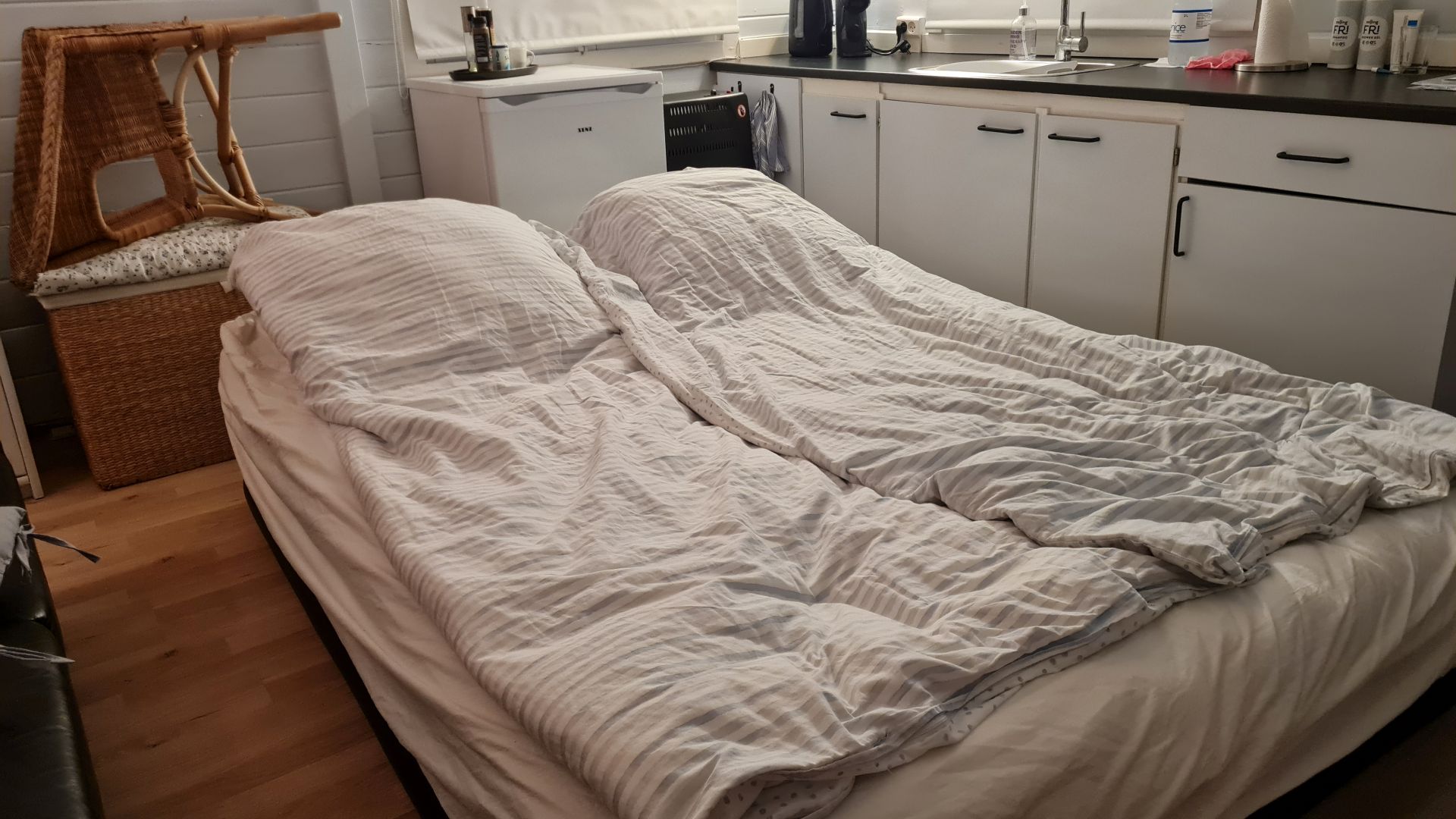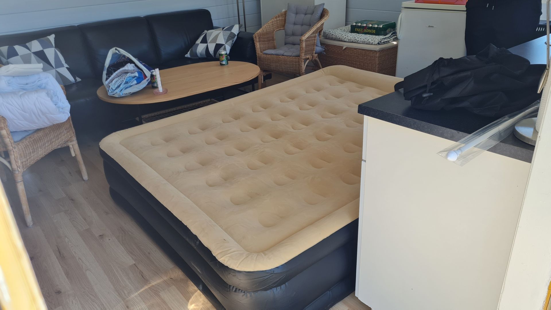 Da vi "fandt" toilettet og fik det ordnet, så kunne vi jo også sove i sommerhuset. Vi købte derfor en luftmadrs, som vi kunne puste op og lægge mellem køkken og sofa.