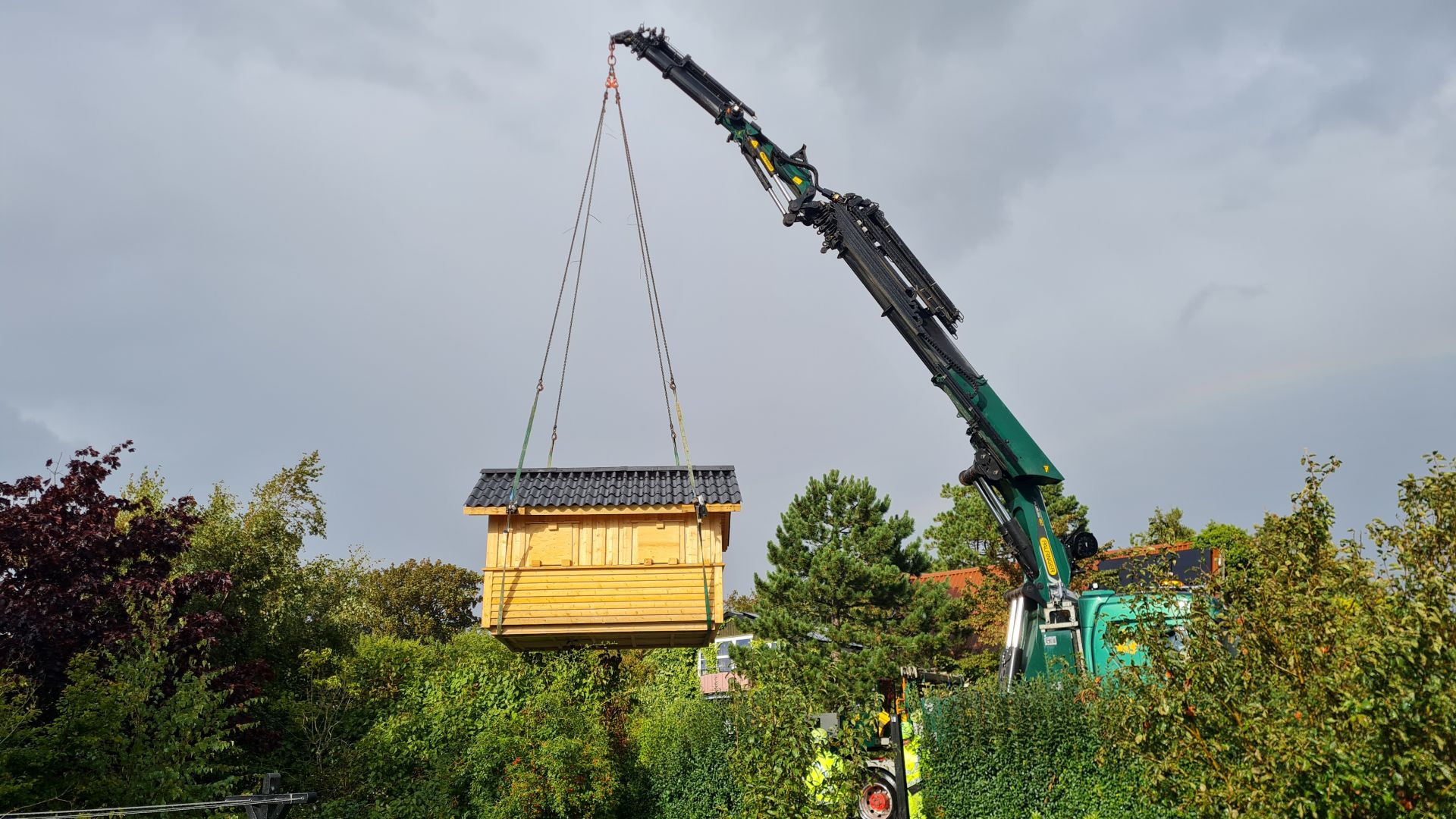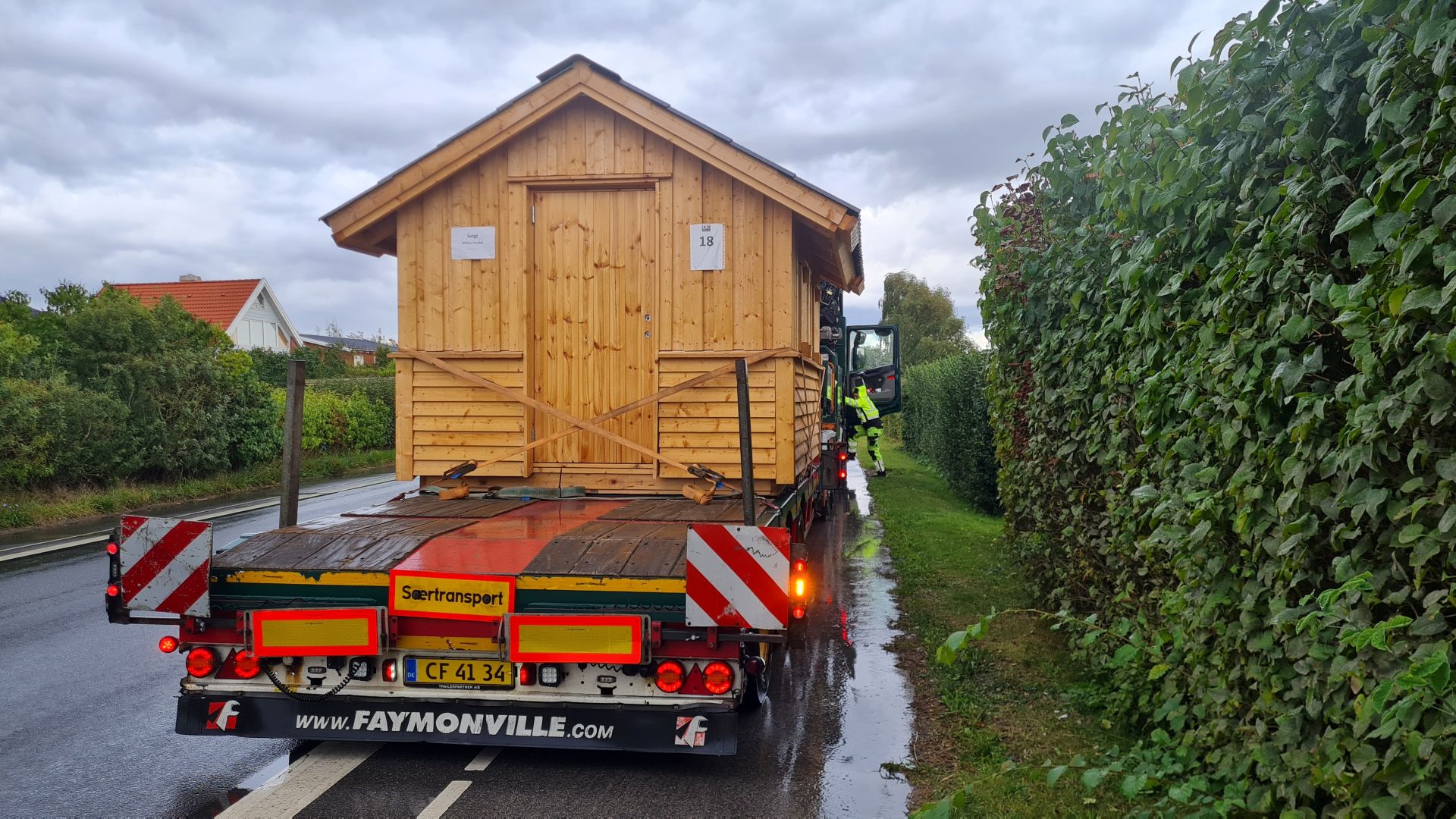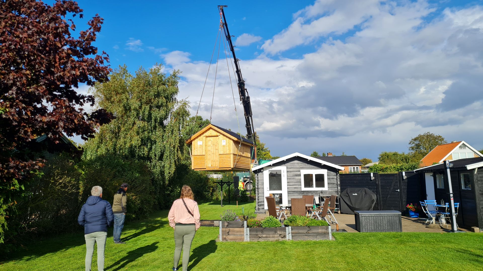 Det skabte lidt trafikkaos på Bildsøvej, da kranvognen stoppede al trafik i den ene vognbane sådan en fredag eftermiddag kl. 15.00 og begyndte at løfte bjælkehytten ind over hækken.