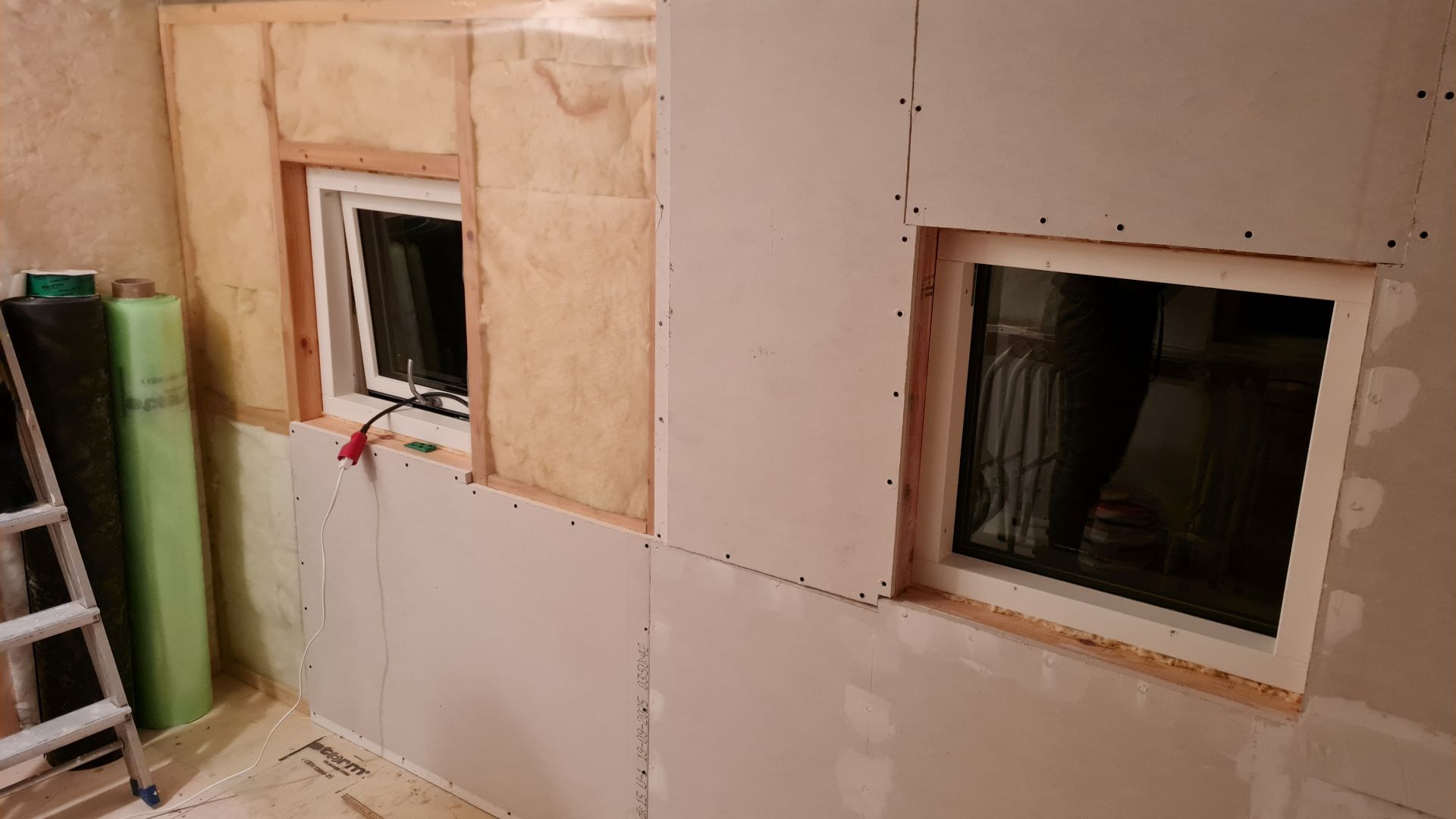 Så er der sat dampspærre op udenpå isoleringen, og vi er begyndt at sætte gipsplader op. Vi har valgt en kraftig 15 mm Ultra Board gipslade fra Knauf. Så får vi en kraftig