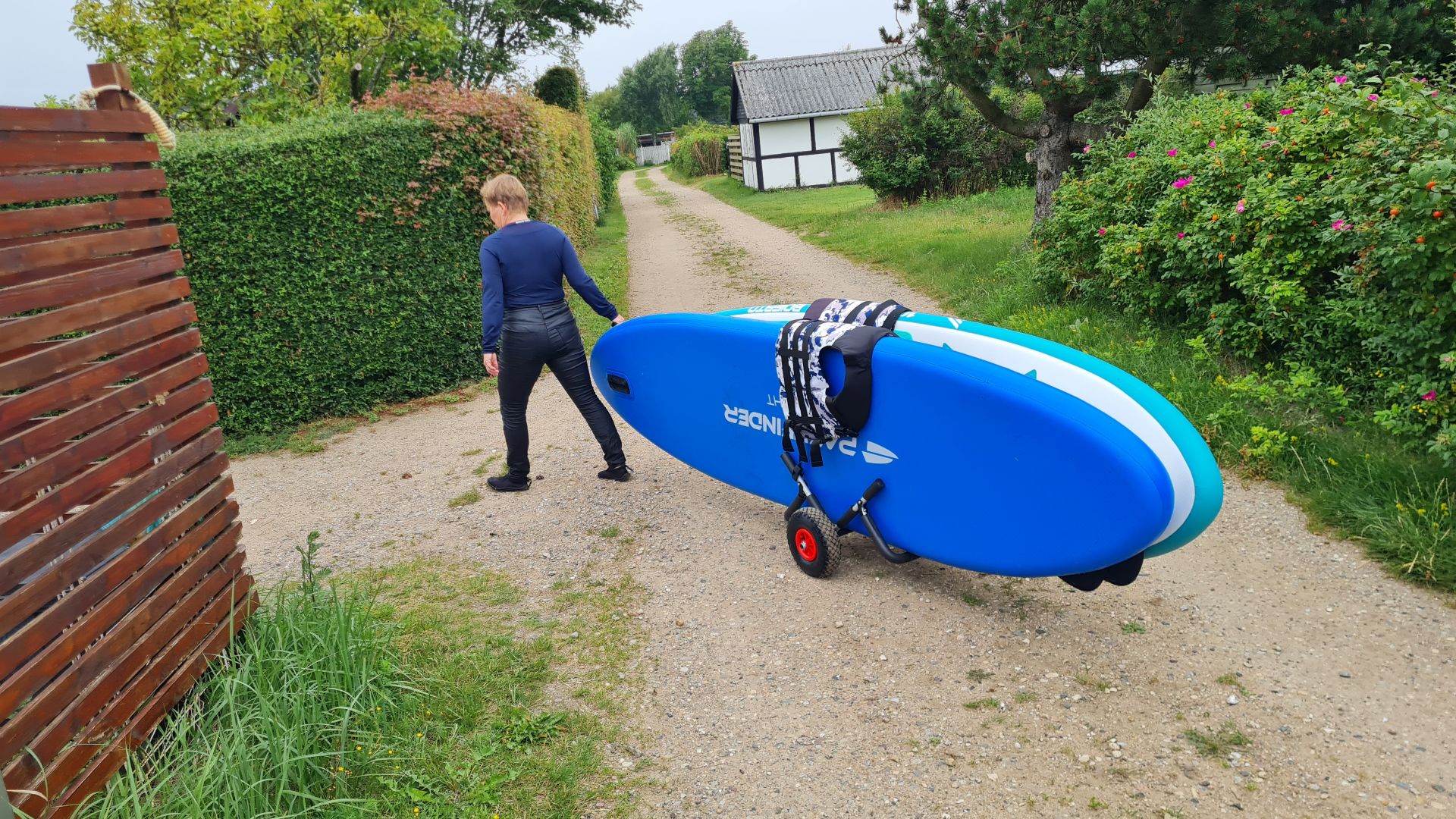 Der er heldigvis kun 400 meter fra sommerhuset ned til stranden ad nogle små sommerhusveje uden meget trafik. Vi har købt en vogn, så vi kan trække to paddleboards uden at bruge særlig mange kræfter.