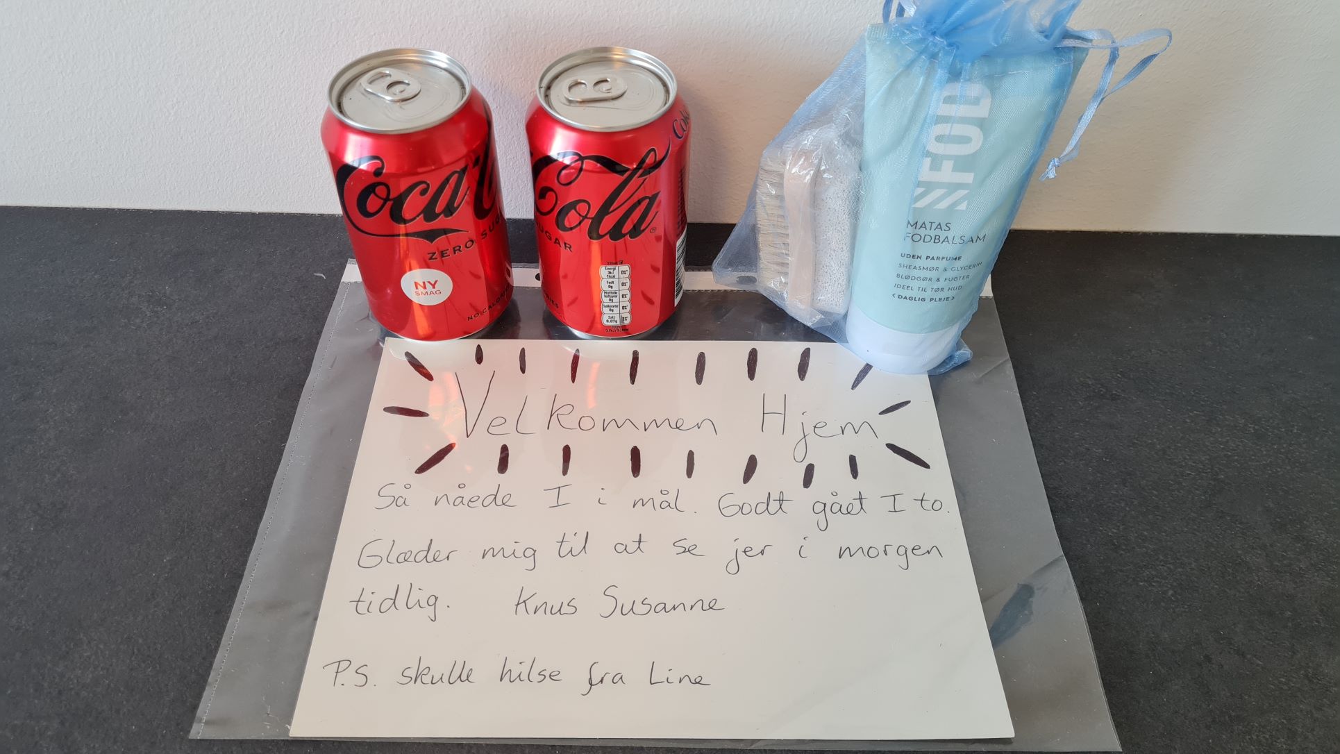 | Da vi kom hjem til huset, havde vores søde løbeveninde Susanne været forbi med colaer og