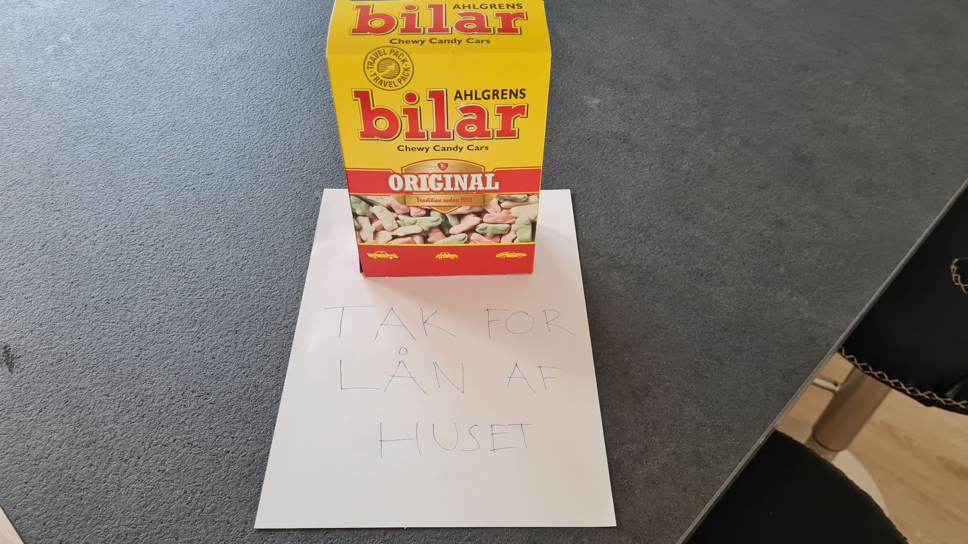 | Vores søn Karl Kristoffer havde lånt og passet på huset, mens vi var væk, og han havde kvitteret ved at