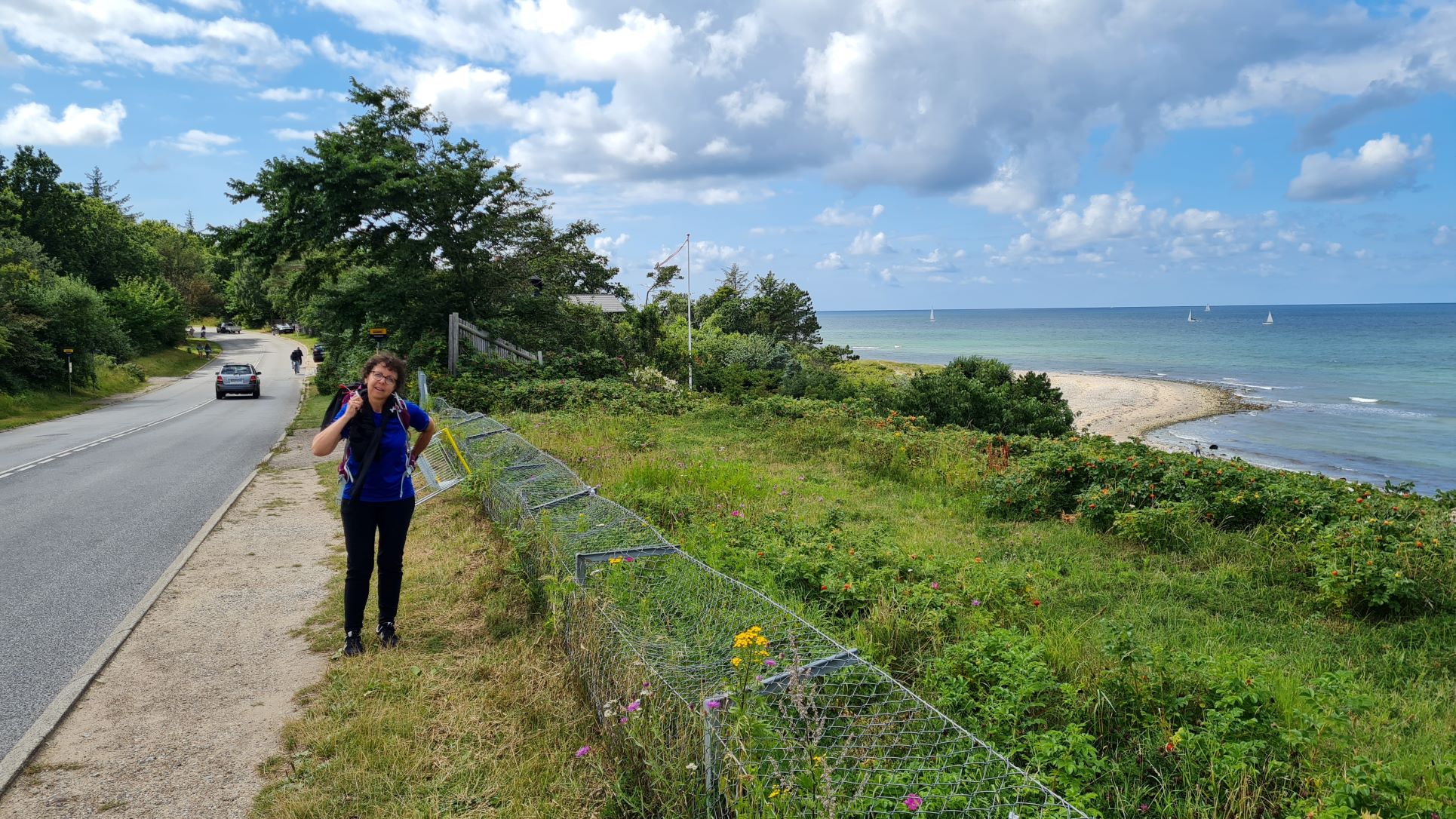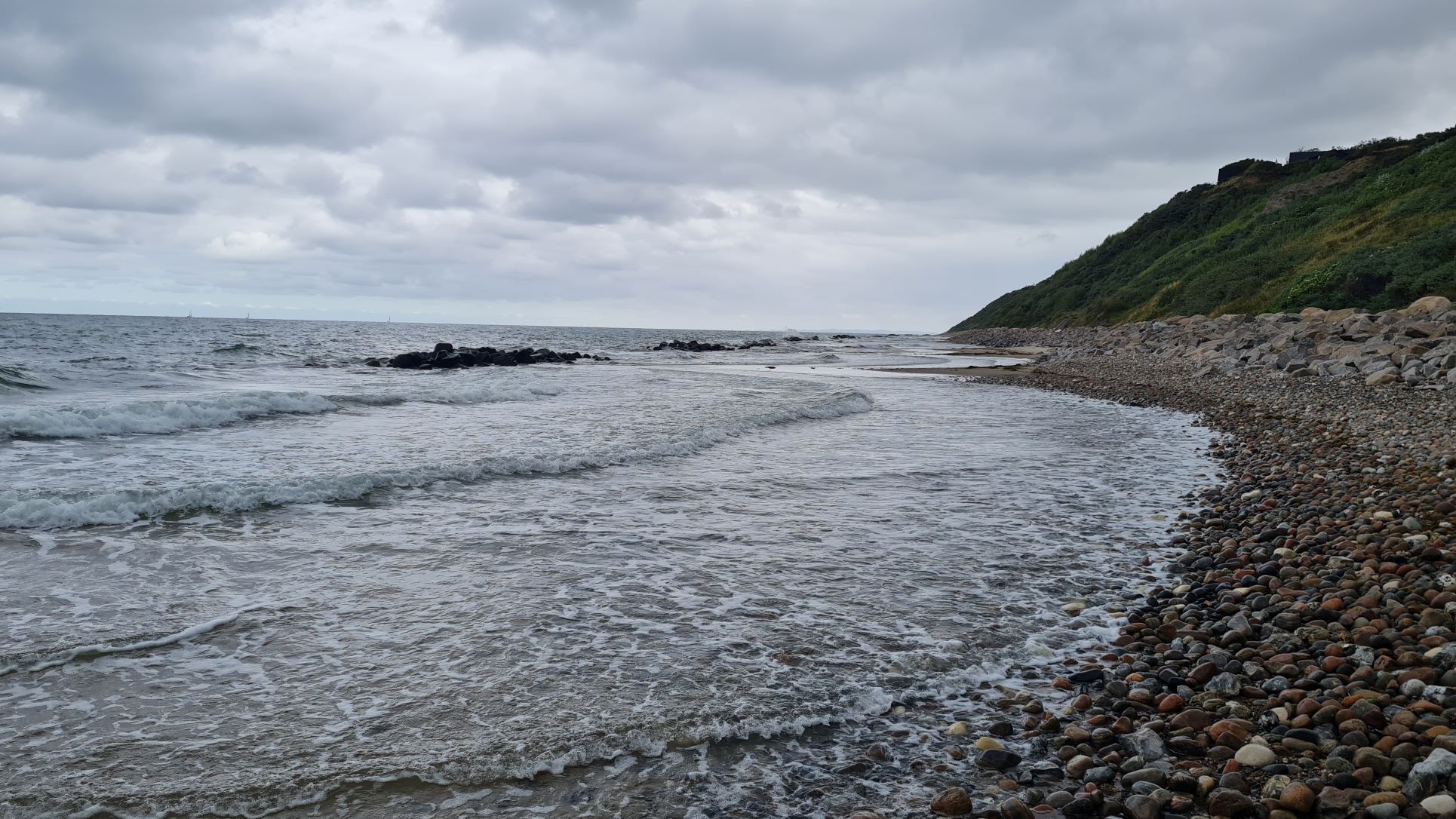 | Her er hele stranden dækket af højvande, så vi måtte kravle op på skrænten.