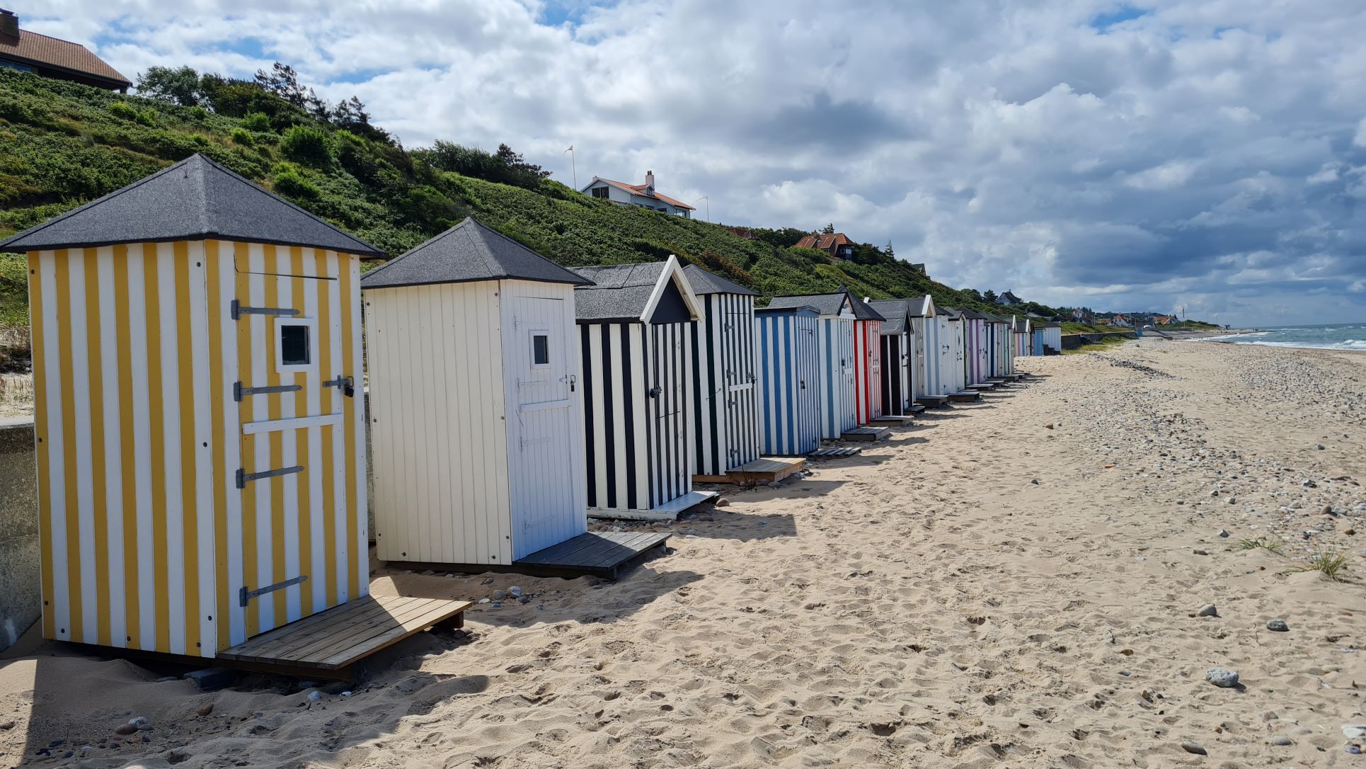 | Så er vi kommet til Rågeleje Strand med de ikoniske stribede badehuse.