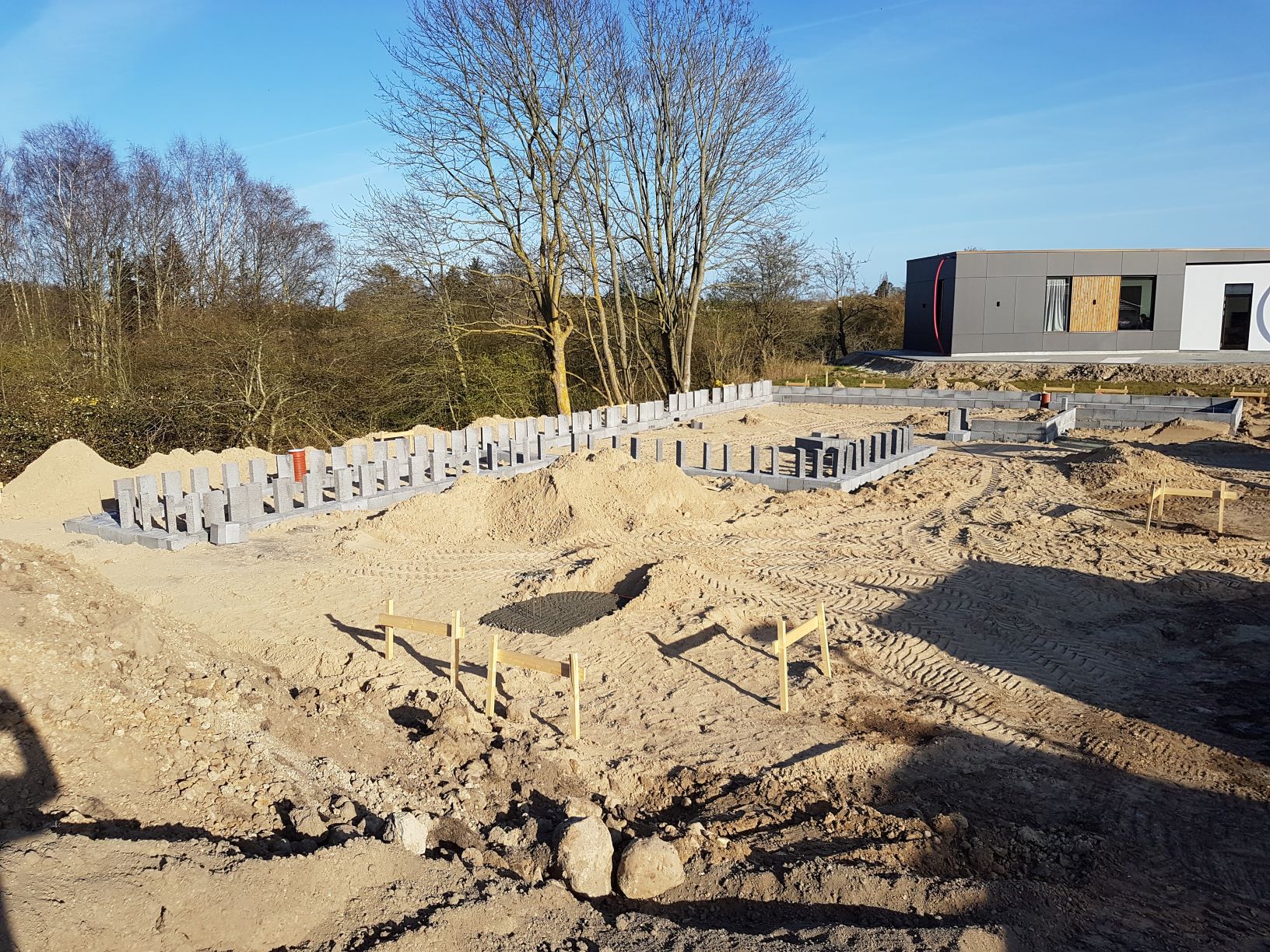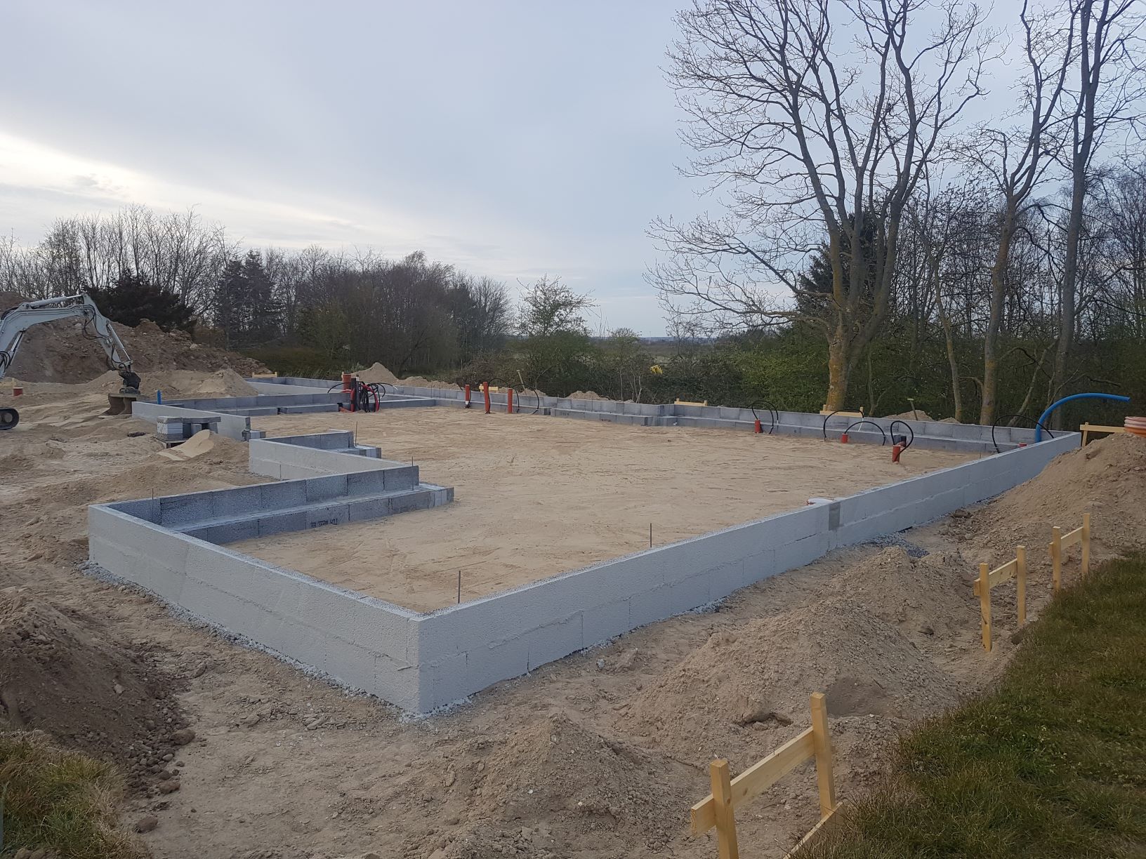 Nu er første del af soklen lavet rundt om huset. Det er virkelig spændende, og nu kan man virkelig få en fornemmelse for, hvor huset kommer til at ligge, og hvordan det kommer til at se ud.