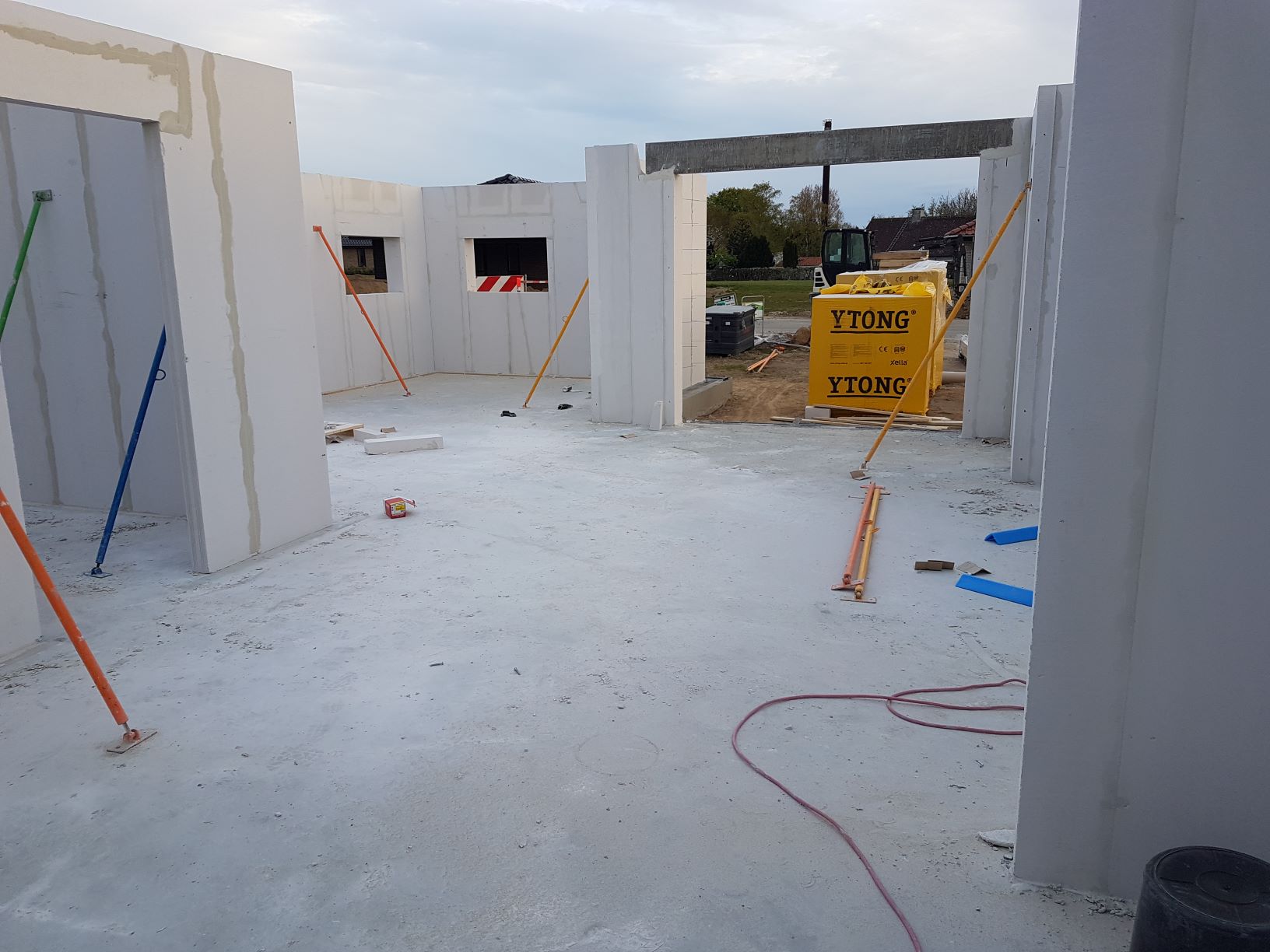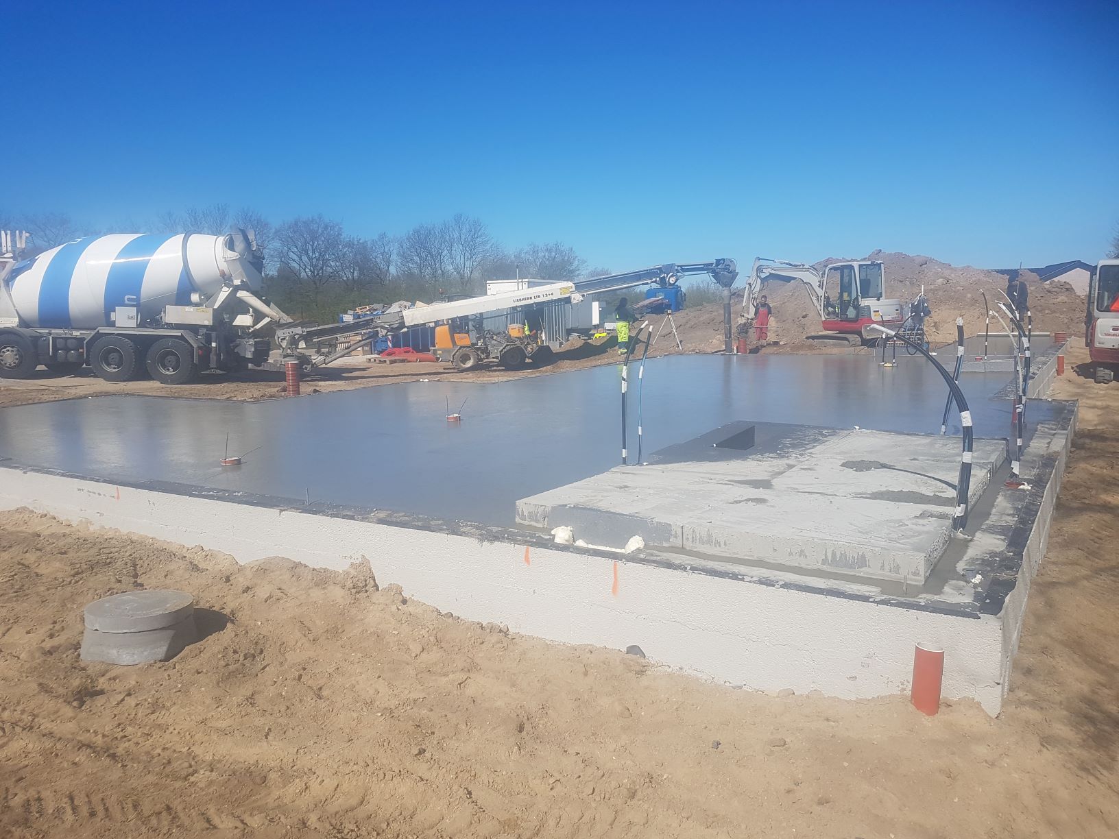 Der bliver ikke spildt nogen tid, så allerede dagen efter kom de store betonkanoner med beton i lange baner, og på under en dag var der støbt gulve.