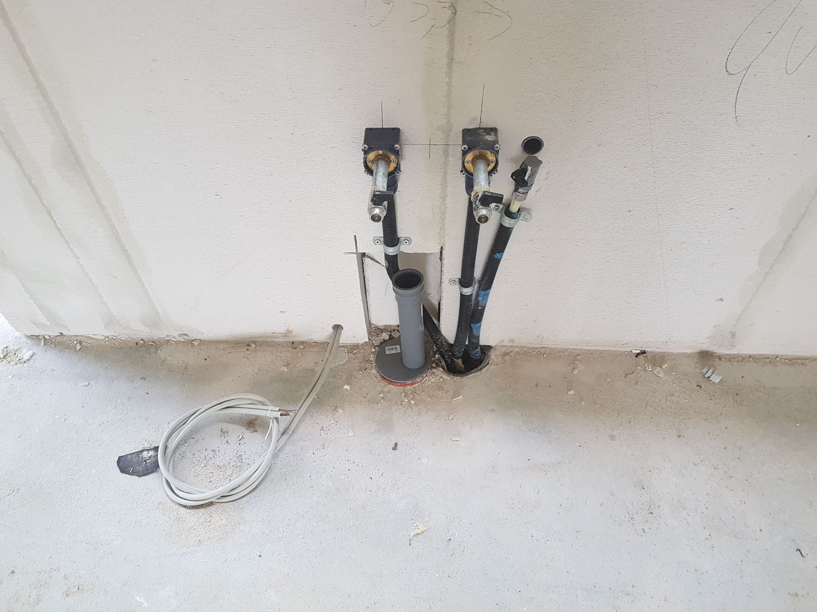 Her er der gjort klar til el, vandtilførsel og afløb til opvaskemaskine og vask i køkkenet og rørføring til udendørsvandhane.
