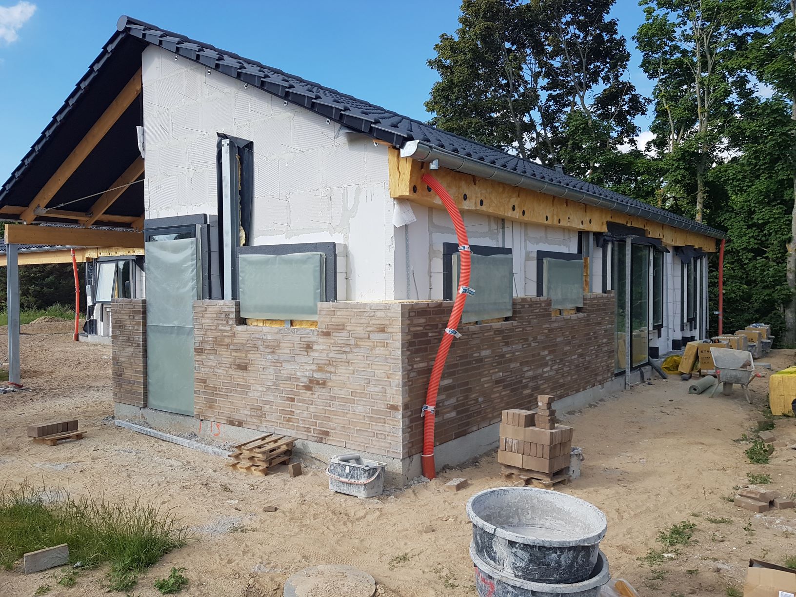 Der er sat paller med mursten frem på den sidste side af huset, så nu går det stærkt.