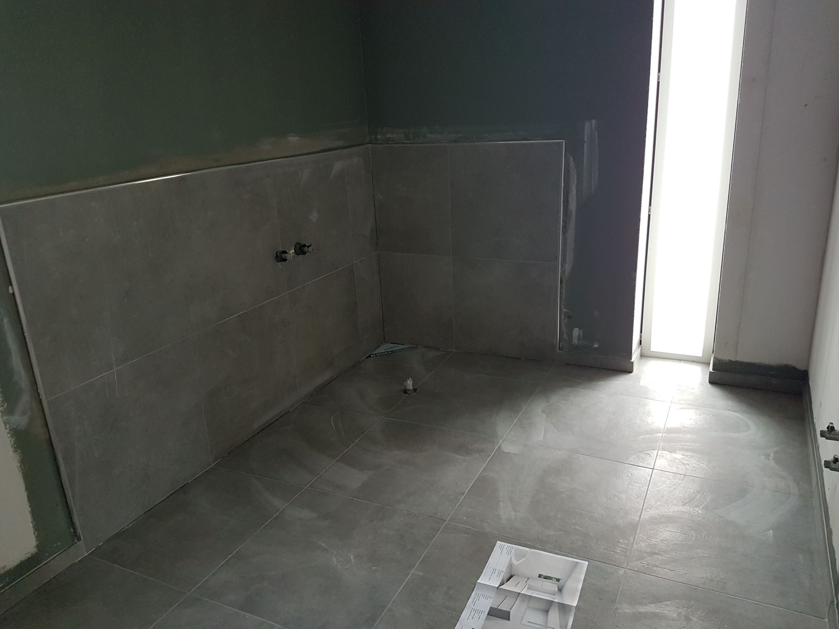 I badeværelset skal vi have et fritstående badekar, så her er der sat 2 fliser op i højden bag badekarret. Fliserne er afsluttet med en pæn alu-profil.